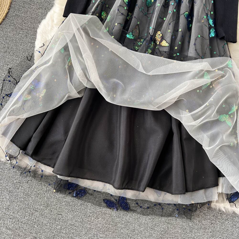 French dress women's 2021 new slim temperament long-sleeved knitted stitching floral embroidery mesh skirt trendy ロング 刺繍 メッシュ 花柄 スカート スリム ステッチ lyxaj6723788549