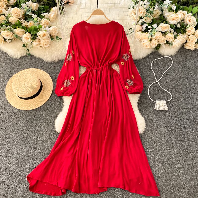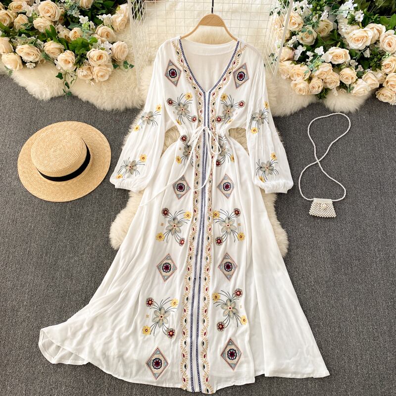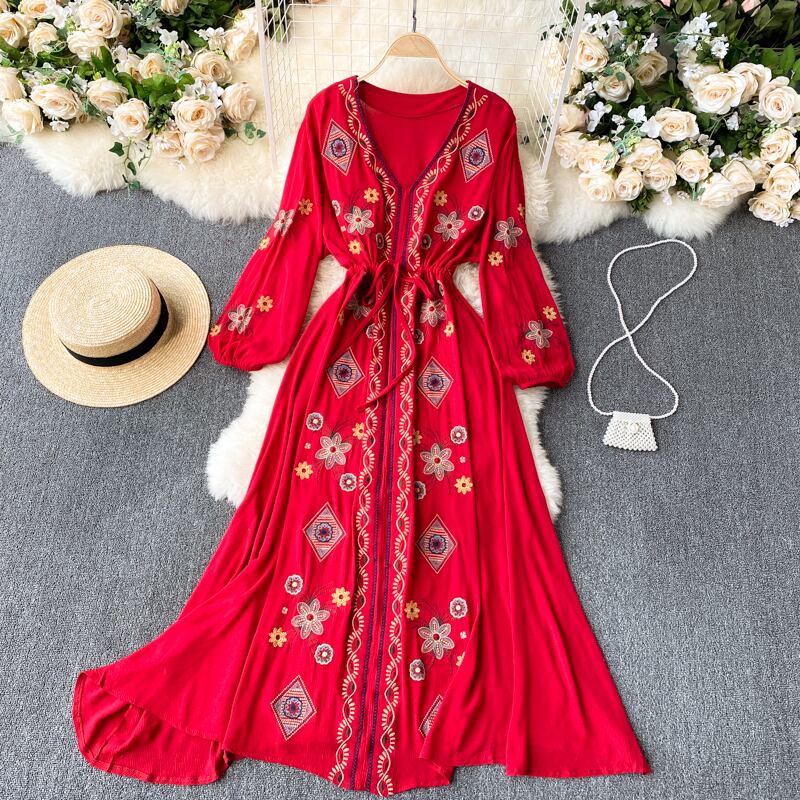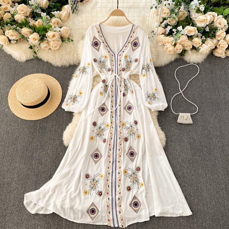Bohemian national style heavy industry embroidery cotton and linen comtable V-neck long-sleeved waist tie holiday dress long skirt ロング コットン 刺繍 スカート Vネック lyxaj22391808354