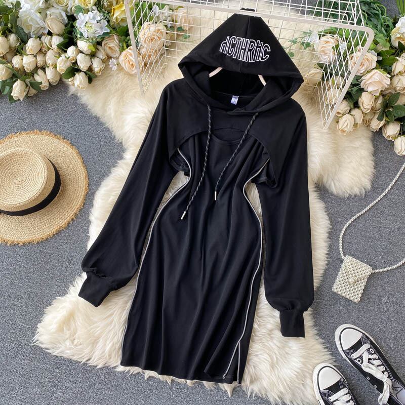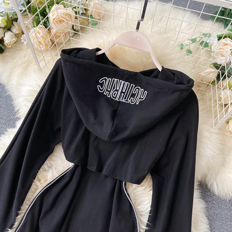 ダークレディースセータースーツ2020新しいレディースデザインフード付き長袖アウター+スリングドレス ロング lyxaj31355721276