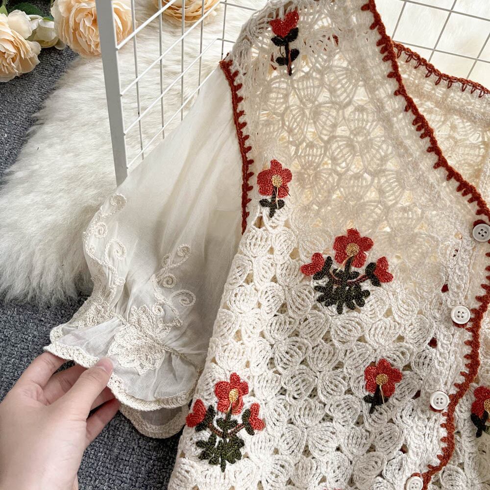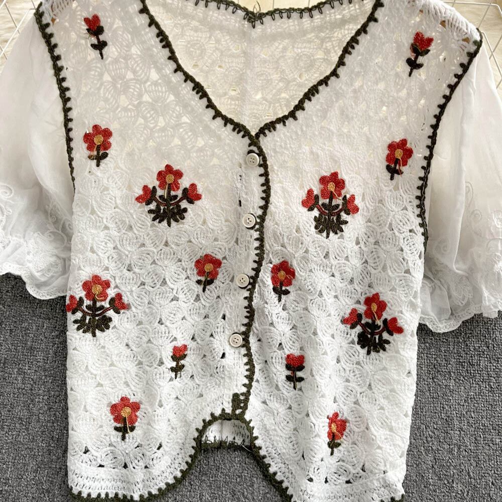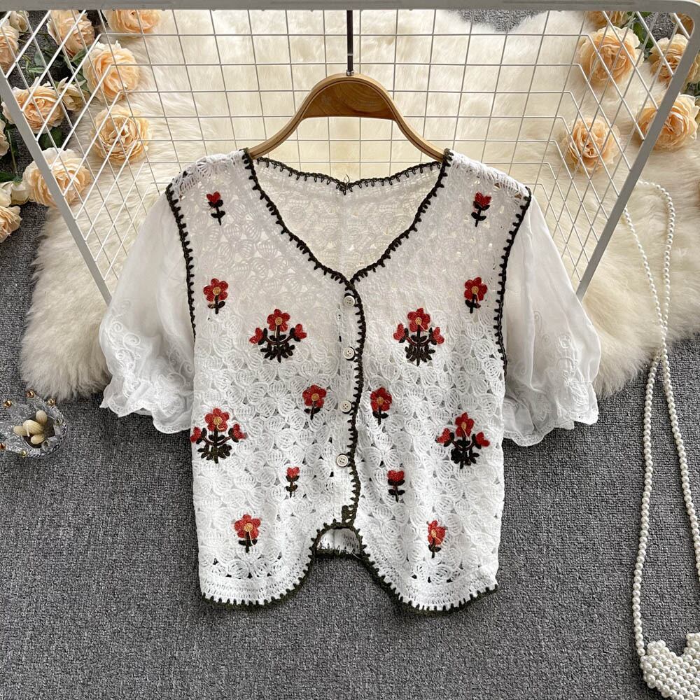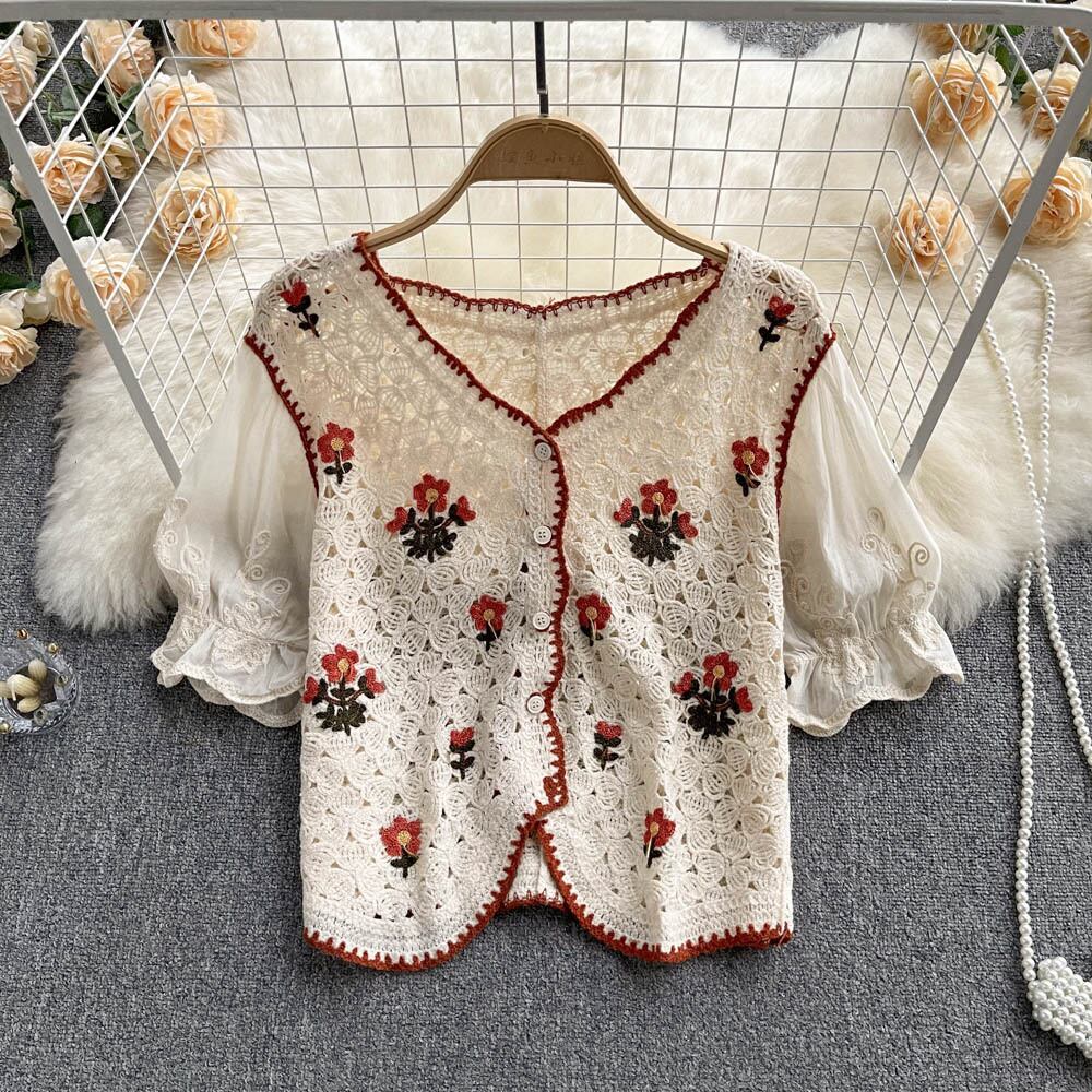 サマードレス2022新しいレトロ香港フレーバーVネック刺繡半袖ニットカーディガン薄片女性ニッチショートトップ 刺繍 夏物 lyxaj69502429000