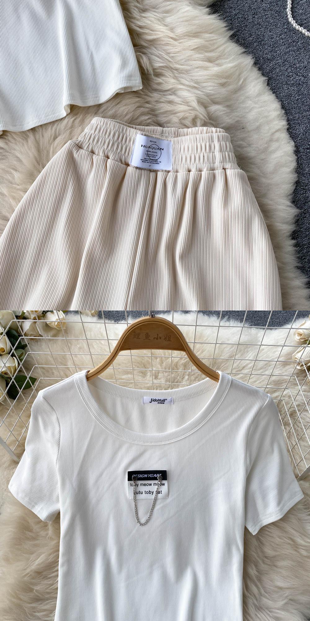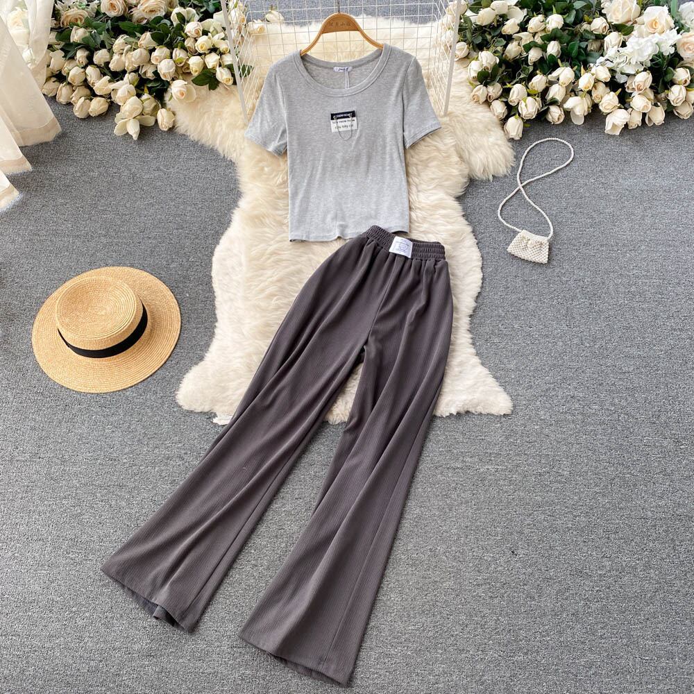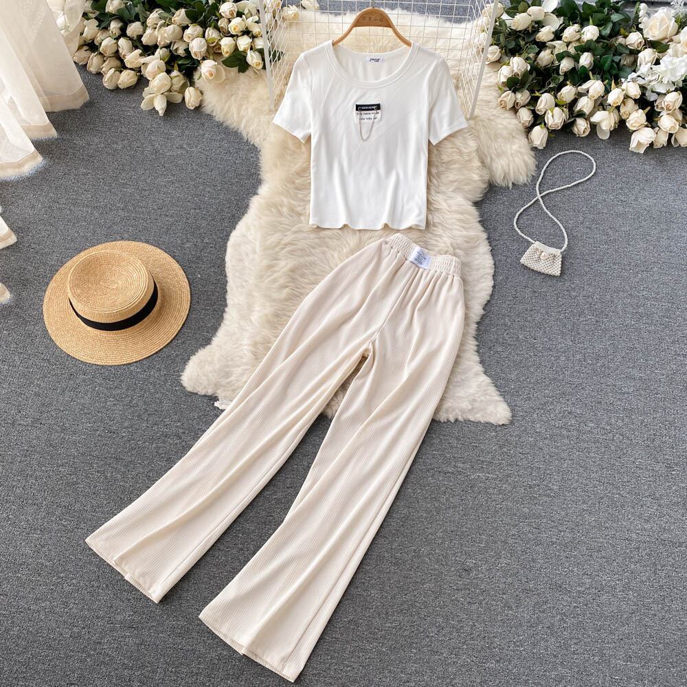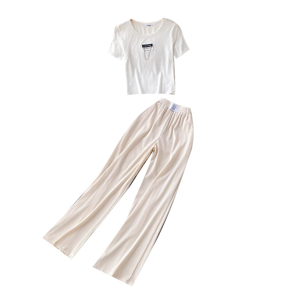ヨーロッパとアメリカのレターチェーンイン半袖Tシャツ女性のハイウエストドレープカジュアルストレートパンツワイドレッグパンツツーピーススーツタイド ハイウェスト ヨーロピアン lyxaj75744570888