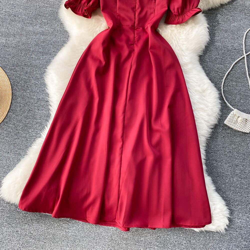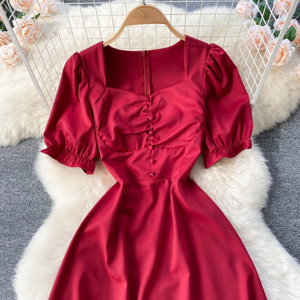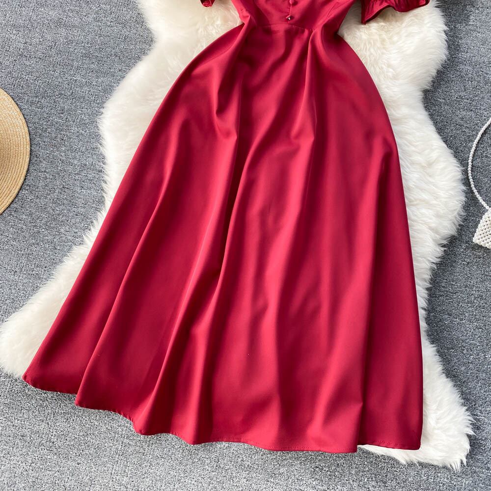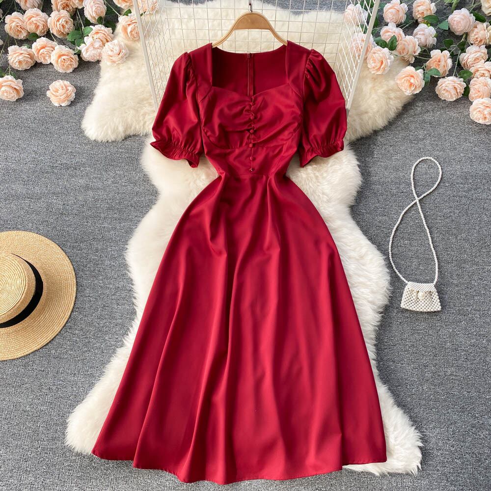 ソリッドカラードレス女性の夏フランスの年齢を減らすパフスリーブスリムレトロヘップバーンスタイルのレディースハイエンドドレススカート サマー 夏物 lyxaj70192313787