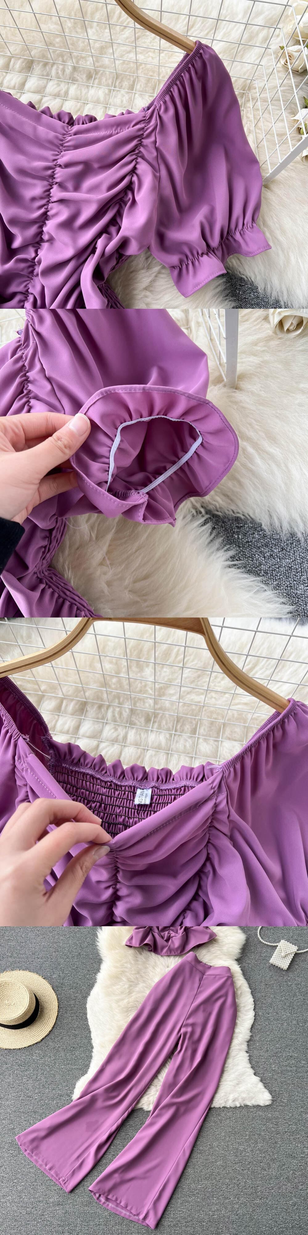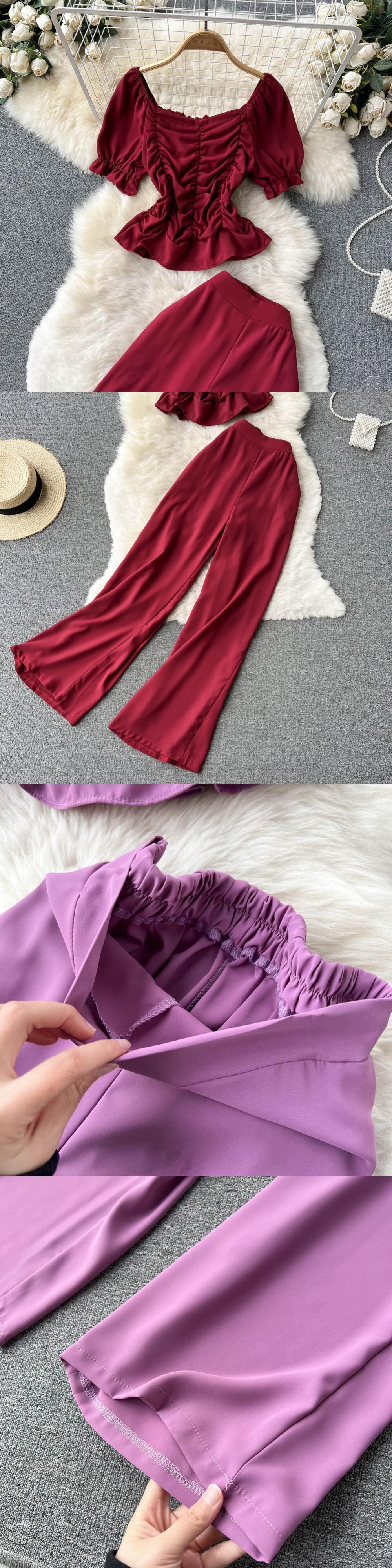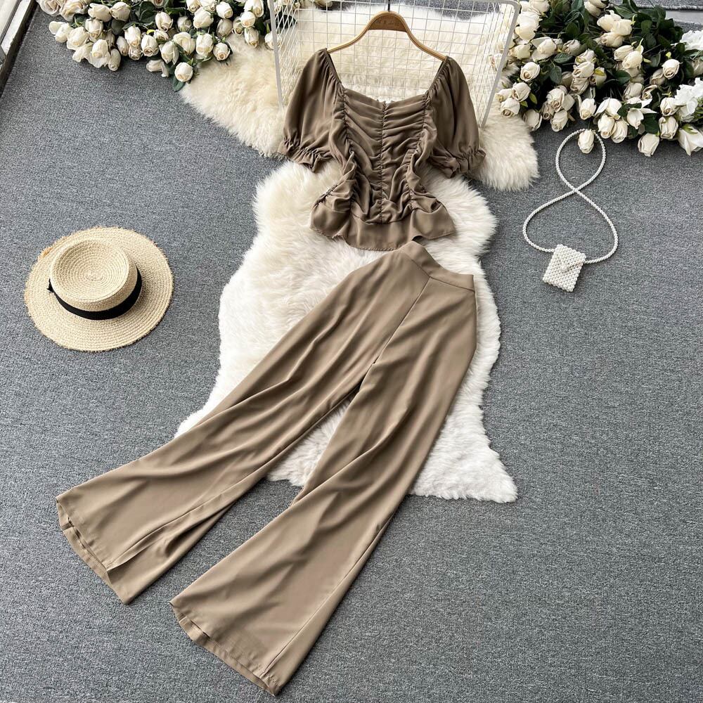 夏の新作スクエアネックパフスリーブプリーツショートウエストトップツーピーススーツハイウエストスリムカジュアルワイドレッグパンツ サマー 夏物 スクウェア lyxaj76375603232