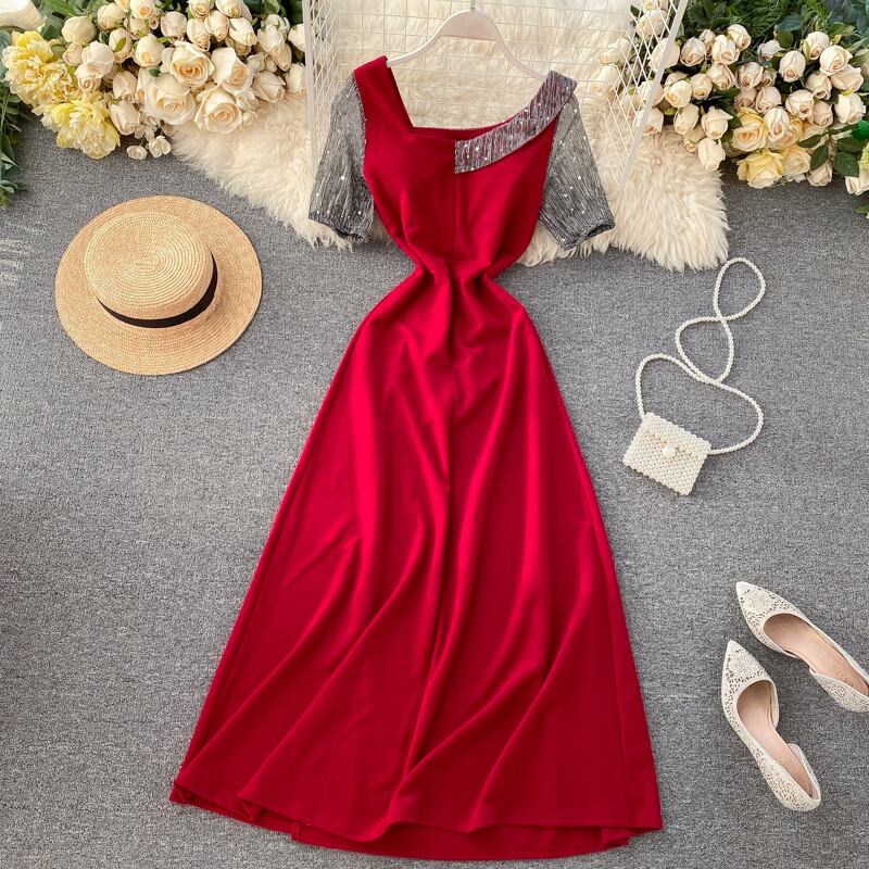 セレブ気質ドレスドレス女神ファンファッショナブルなデザイン斜めネックウエストスリムレトロ膝丈ワンピース lyxaj40338811846