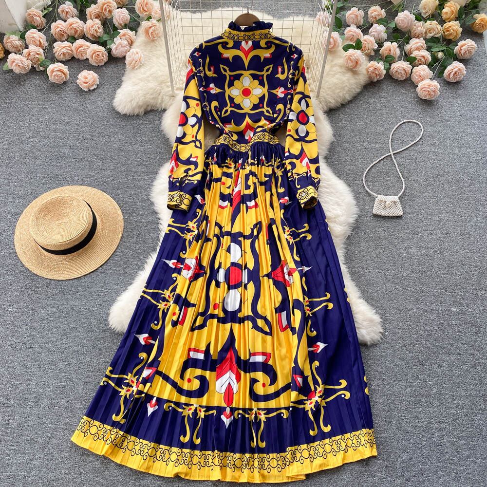 2022年春の新しいフリルスタンドネックストリーマー長袖プリントプリーツファッション洋風ラージスイングドレスロングスカート スプリング 春物 lyxaj26358903012