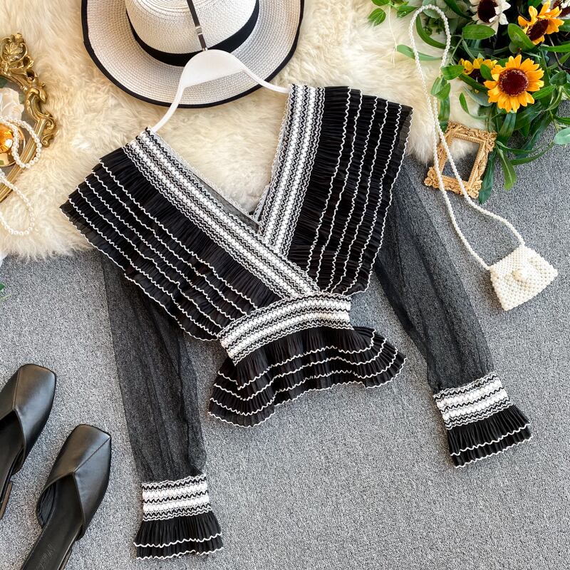Celebrities with the same chic fairy palace ladies temperament V-neck lotus leaf waist waist eign-style mesh long-sleeved top ロング レース メッシュ Vネック lyxaj85671506822