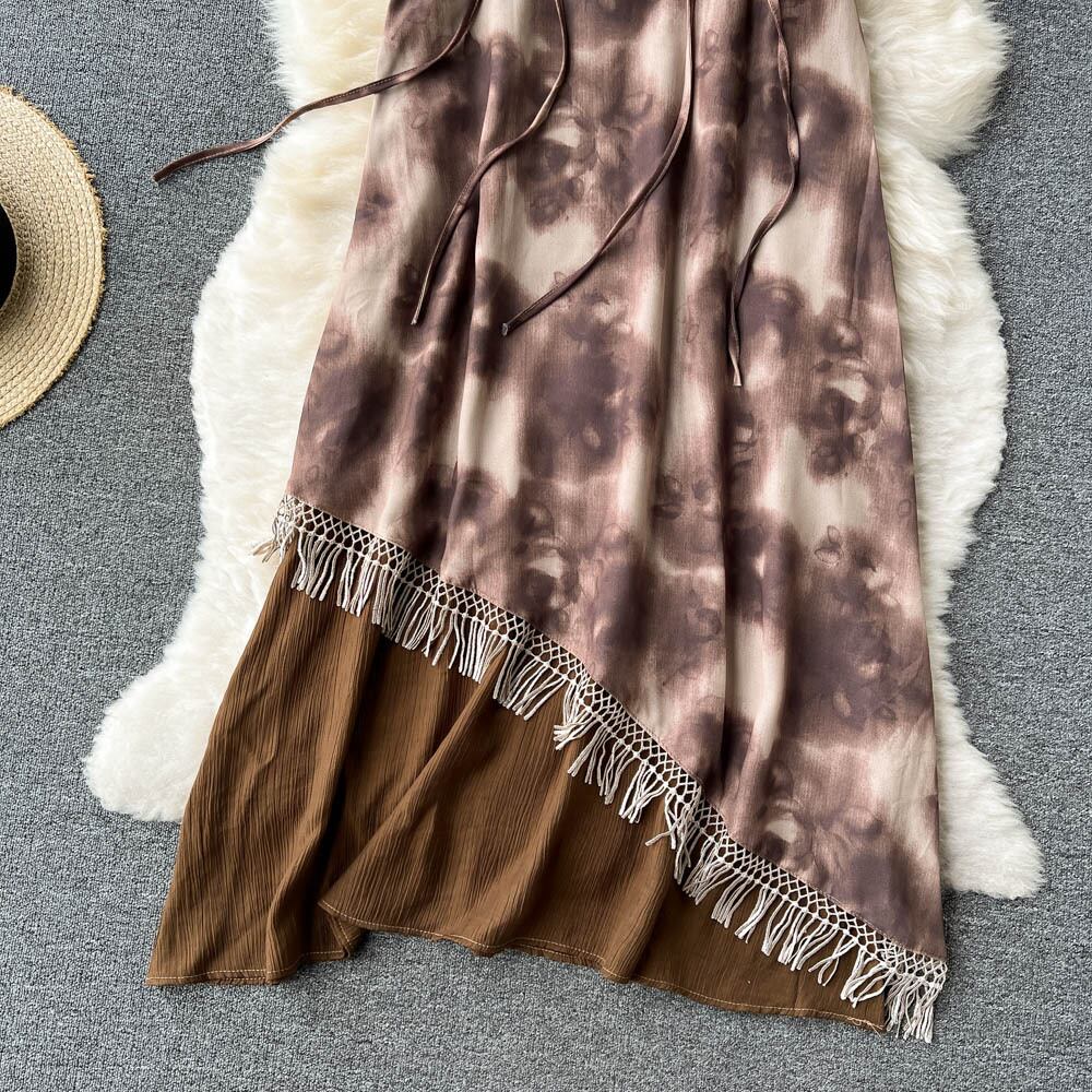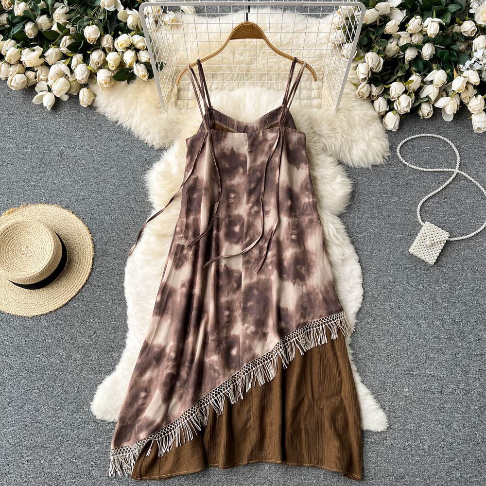 フランスのレトロなヘップバーンスタイルのタッセルコントラストカラーステッチサスペンダースカート女性の夏の新しいシックなオールマッチプリントサスペンダースカート サマー 夏物 lyxaj13630572164