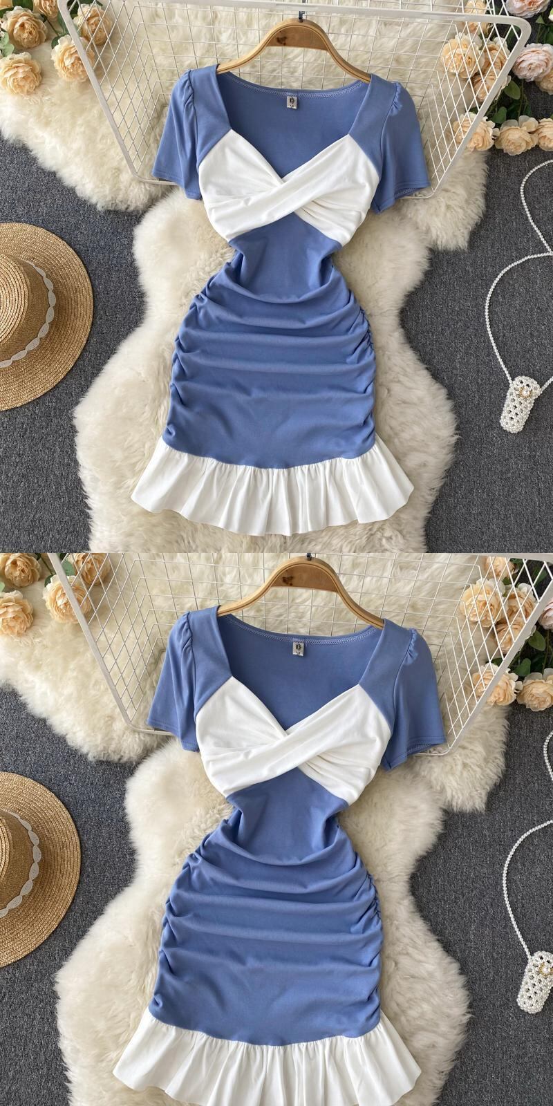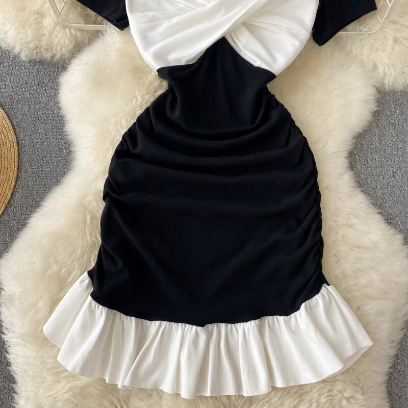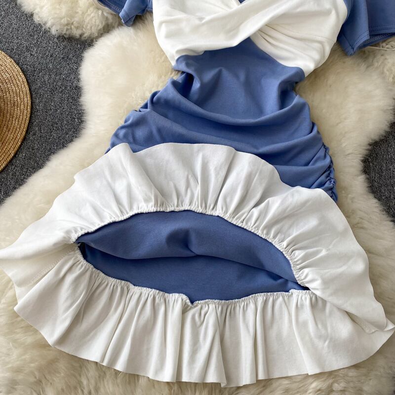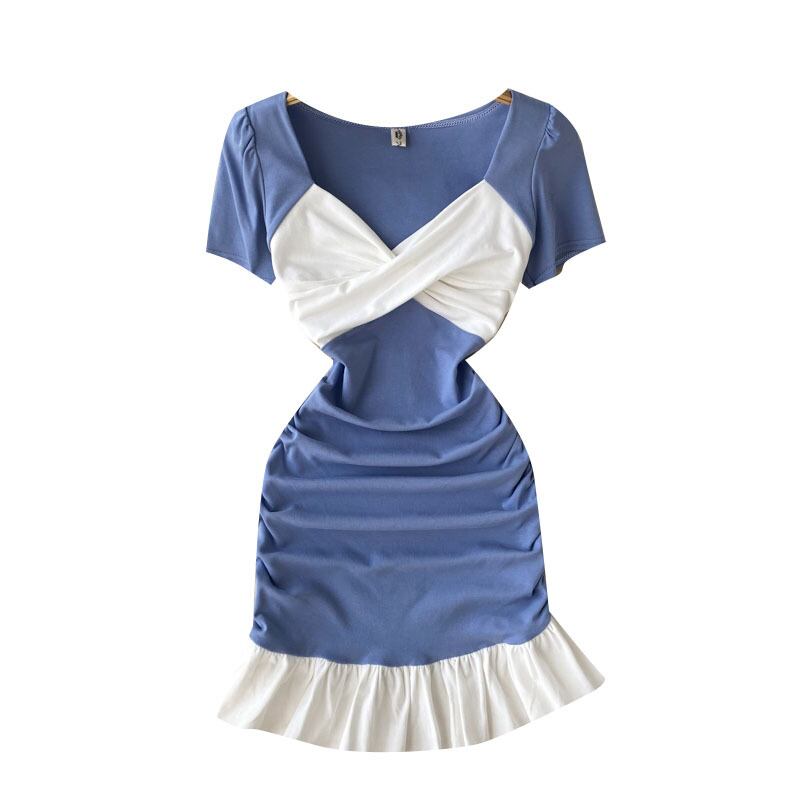 2022年夏の新しいコントラストカラークロスVネック気質は薄いプリーツフリルバッグヒップ半袖フィッシュテールドレス サマー 夏物 lyxaj12218463365