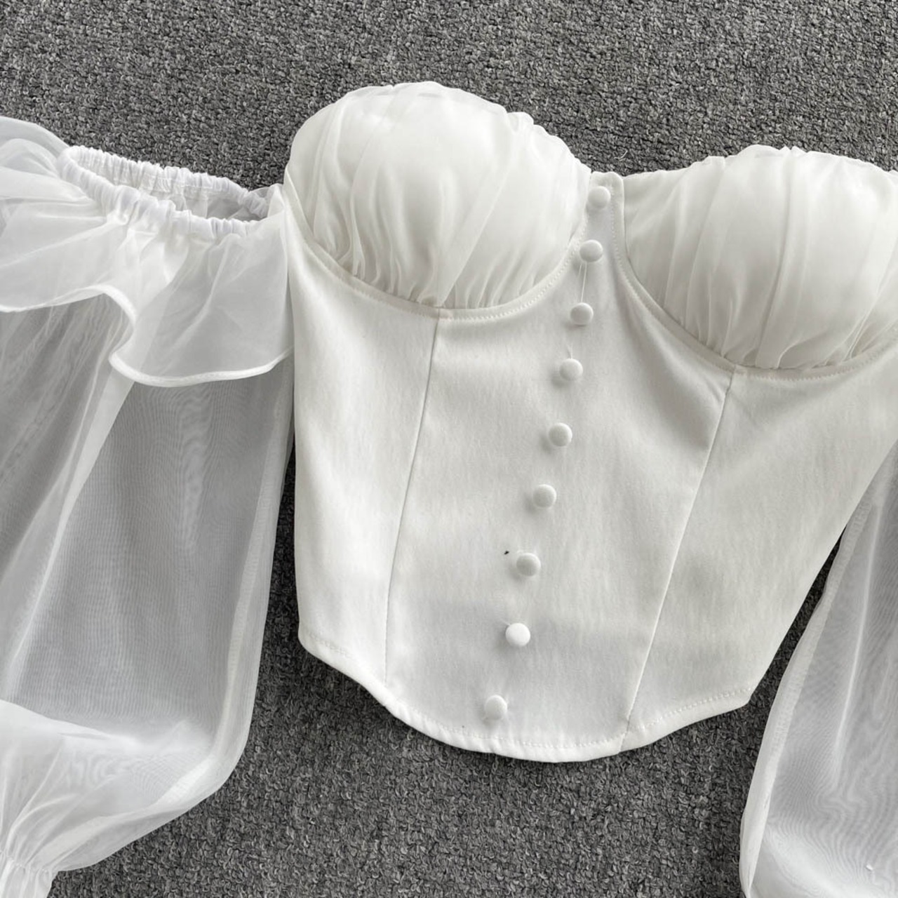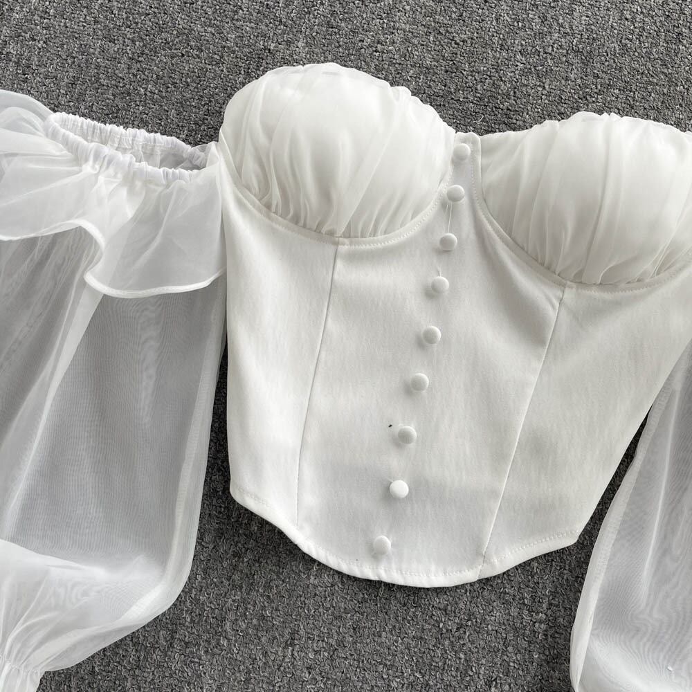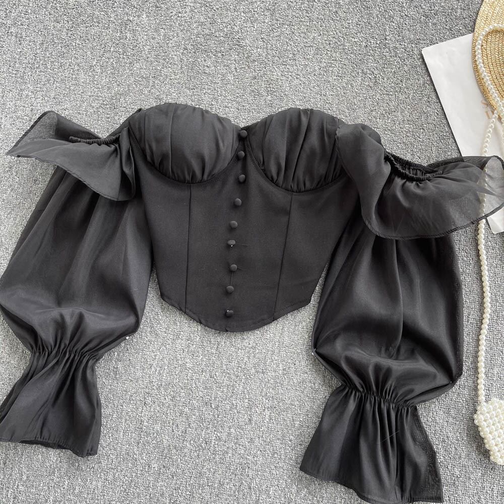 ワンショルダートップフェミニンオフショルダーハイエンド鎖骨ホットガールラップチェストショートシフォンシャツ長袖ウエスタンスタイルシャツ ロング lyxaj61903956645