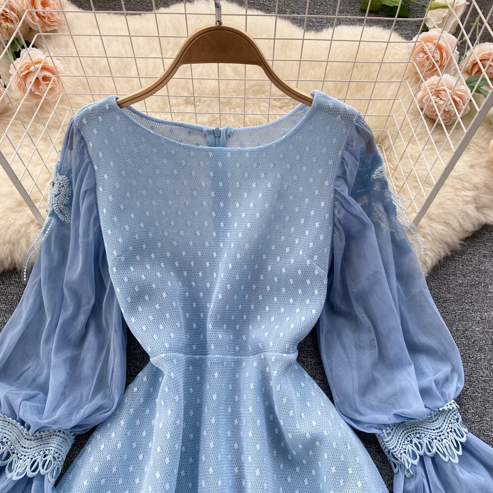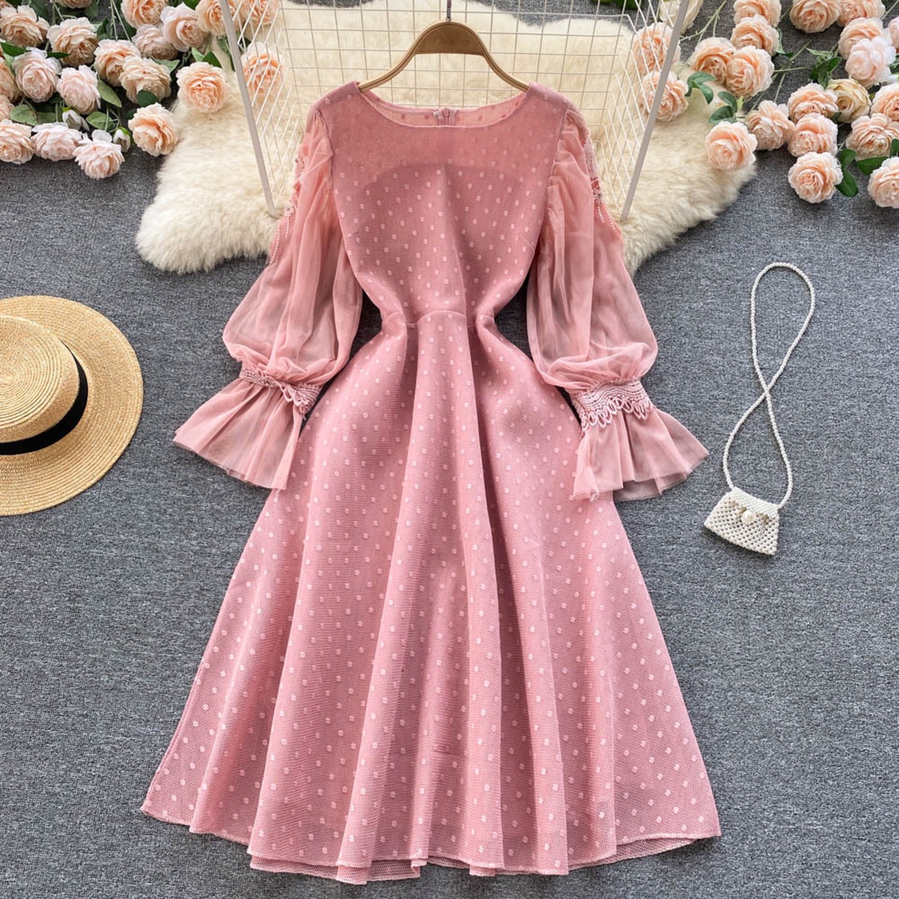 フランスの女の子の甘い気質ウエストドレス春と秋のメッシュステッチランタンスリーブスーパーフェアリーと年齢削減ミドル丈スカート 大人ガーリー スウィート キュート カジュアル スプリング 春物 オータム 秋物 lyxaj45264141564
