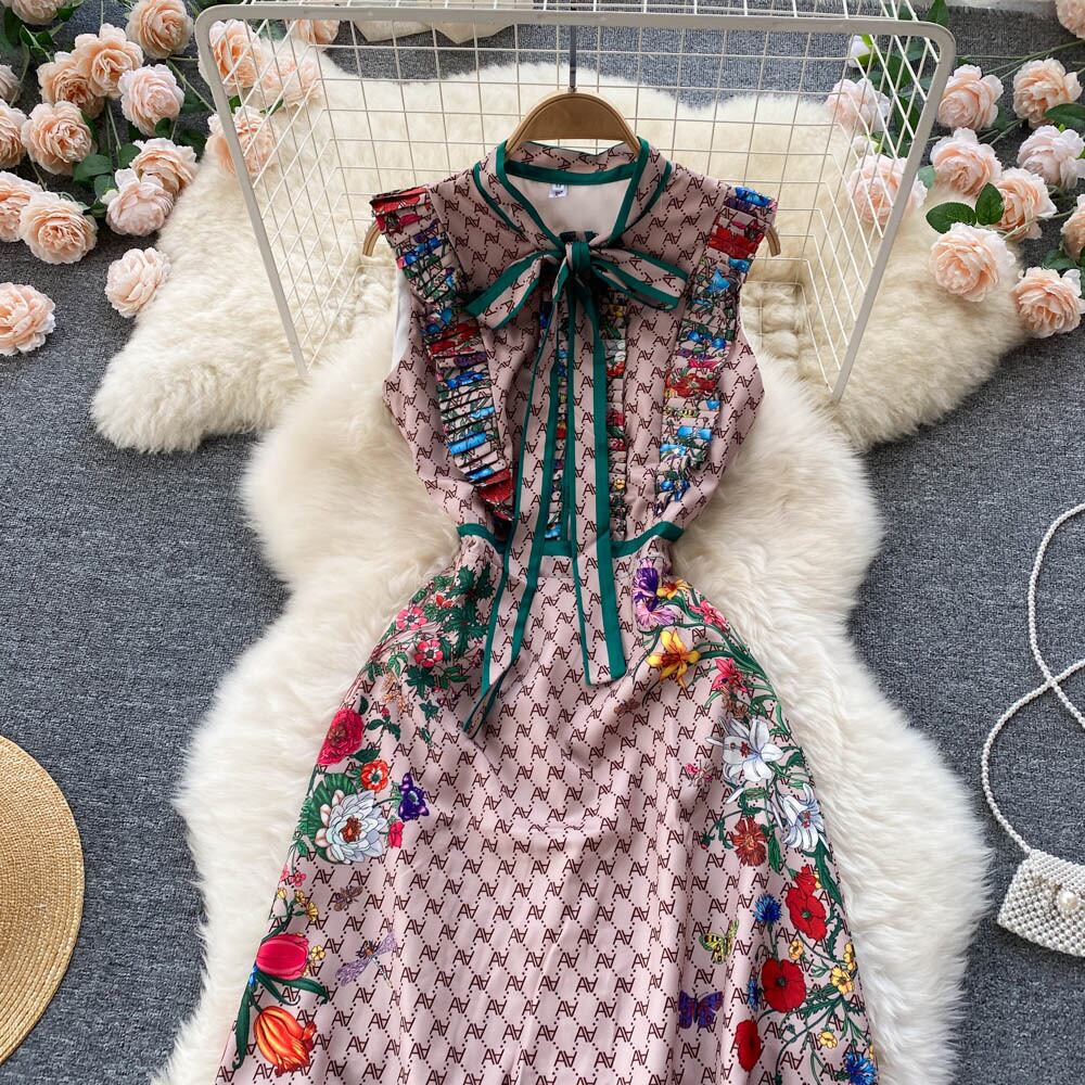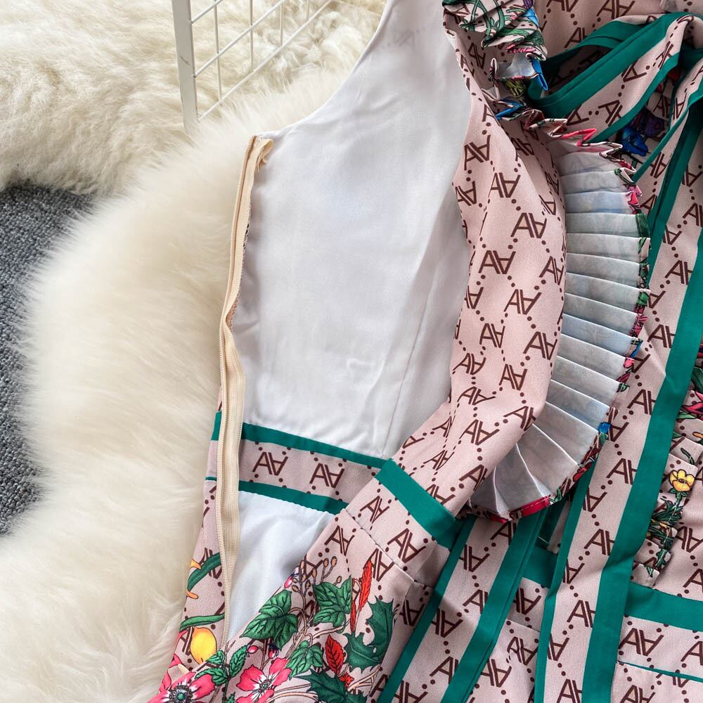 2022 new women's bow tie collar pleated ruffle sleeve waist letter print fashion dress trendy リボン プリーツ lyxaj1935527513