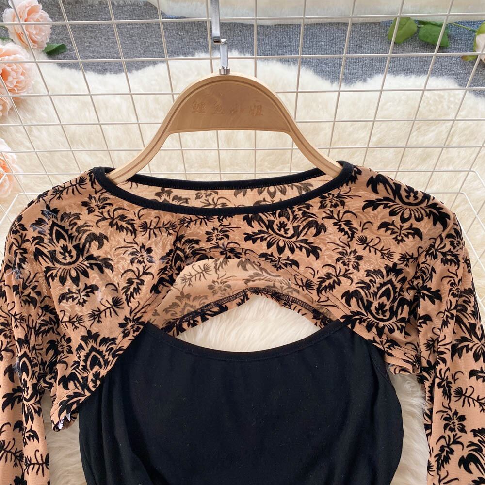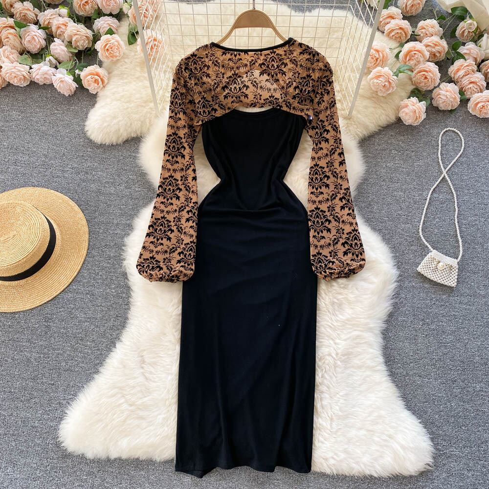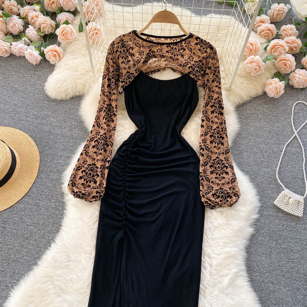 ゆじえライトおなじみスタイルレトロプリント長袖ベストブラウススリムスリムスリングスリットワンピースツーピーススーツ ロング lyxaj11680294593