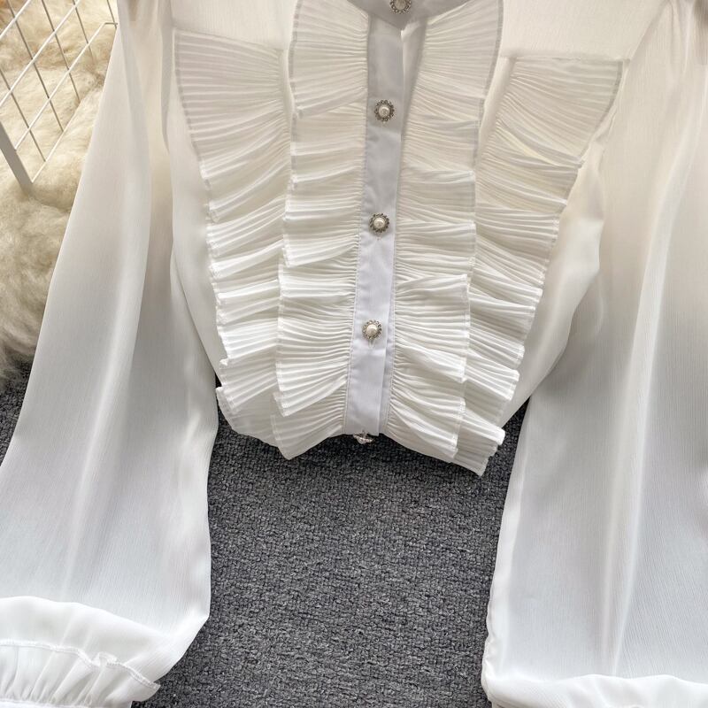 Chiffon shirt women's design sense niche heavy industry pleated double-layer ruffles slim fit all-match long-sleeved women's top spring clothes ロング シフォン フリル ラッフル プリーツ スプリング 春物 スリム lyxaj43149246479