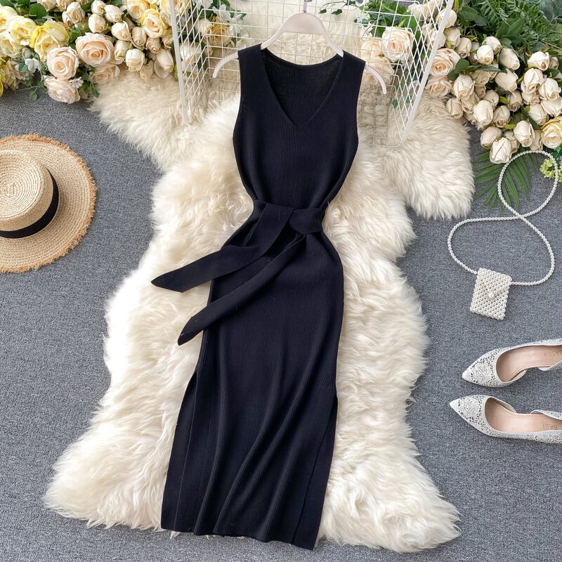 version of fashion net red knitted dress 2020 new women's sleeveless waist tie elastic slit skirt レッド エラスティック 伸縮 ノースリーブ スカート lyxaj42644999184
