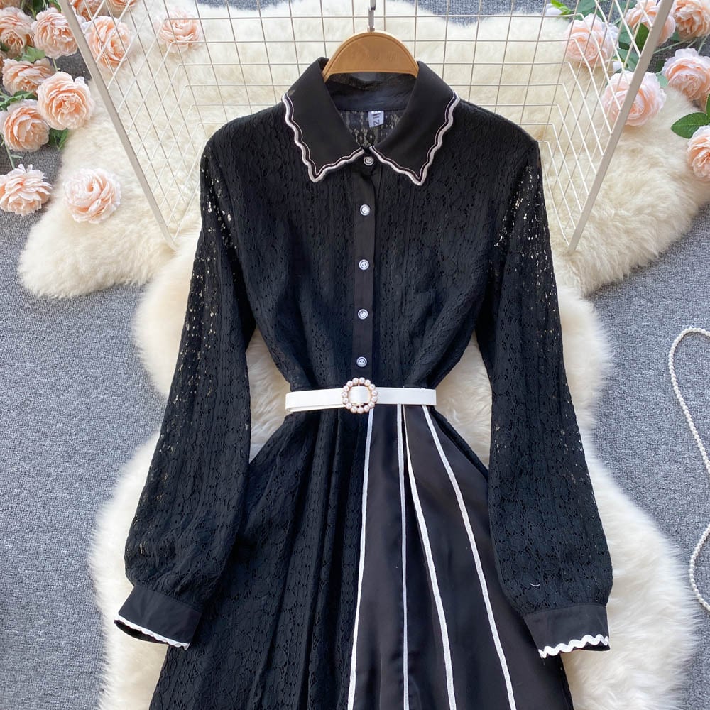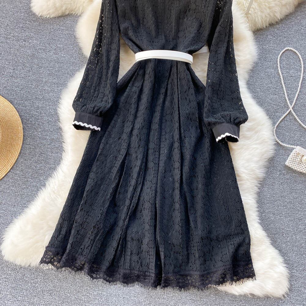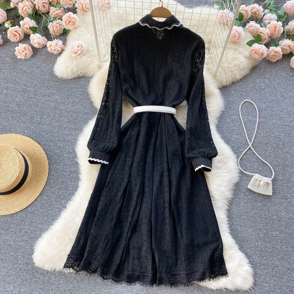 メッシュレースフレンチスタイルウエストと薄手のミドル丈長袖ドールネックワンピースレディース春ライトおなじみスタイルリトルブラックドレス ロング スプリング 春物 lyxaj53605234247