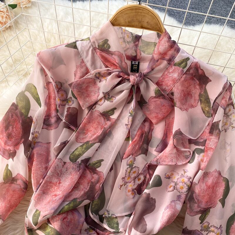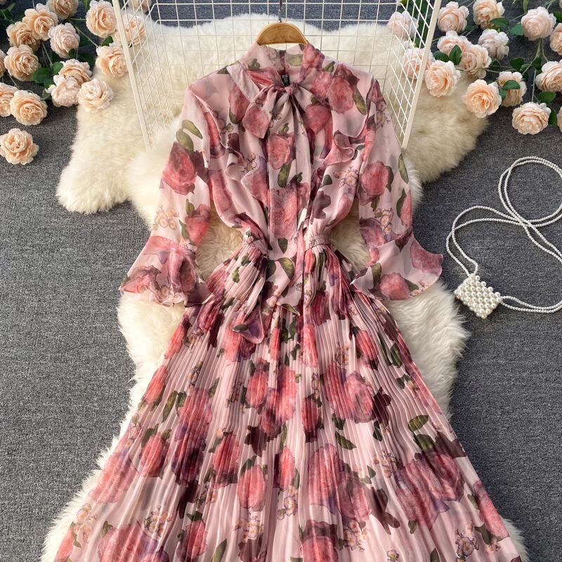 シャツドレス2022初春新作長袖フレンチドレスレトロウエストルーズプリントラージスイングスカート ロング スプリング 春物 lyxaj43267910144