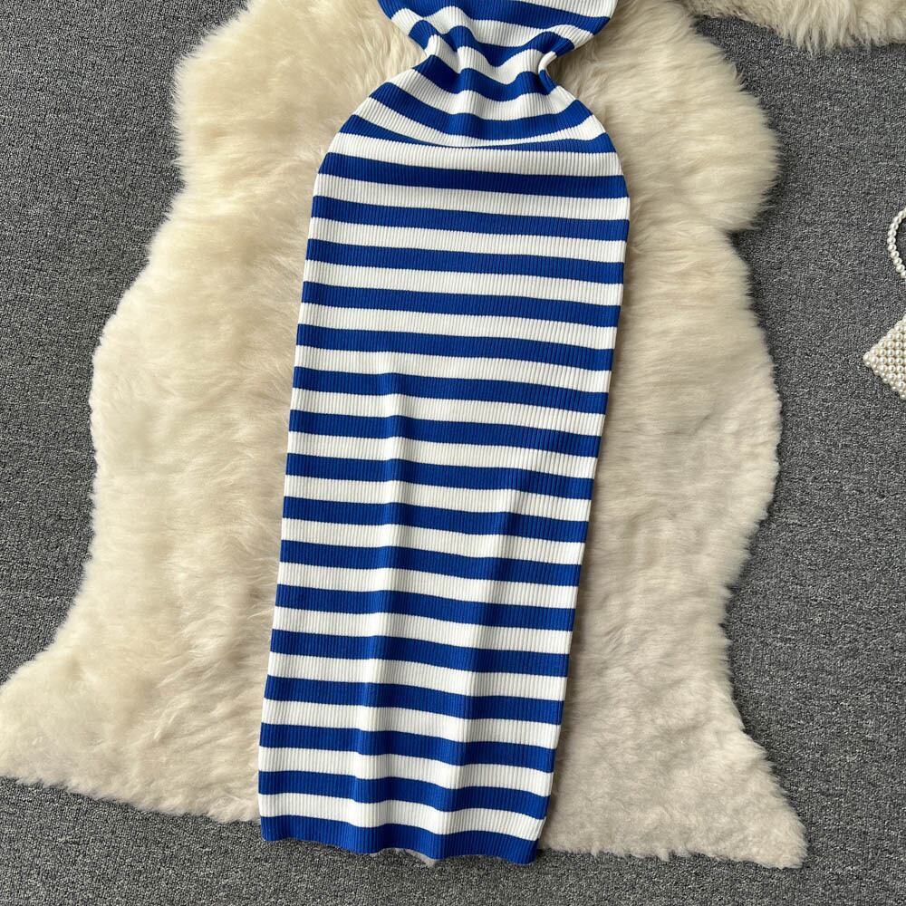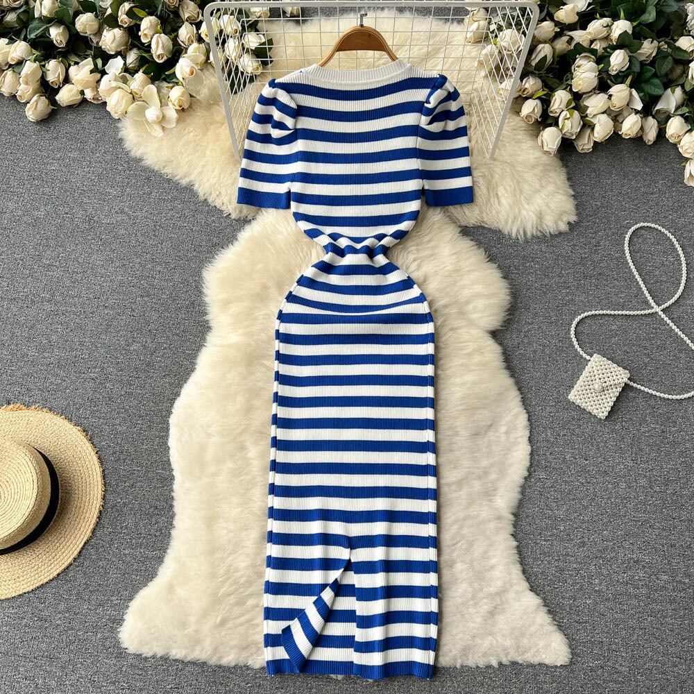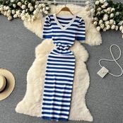 2022年サマードレス新韓国版スリム気質コントラストカラーVネックバッグヒップロングスカートニットストライプカジュアルドレス女性 夏物 lyxaj72097560236