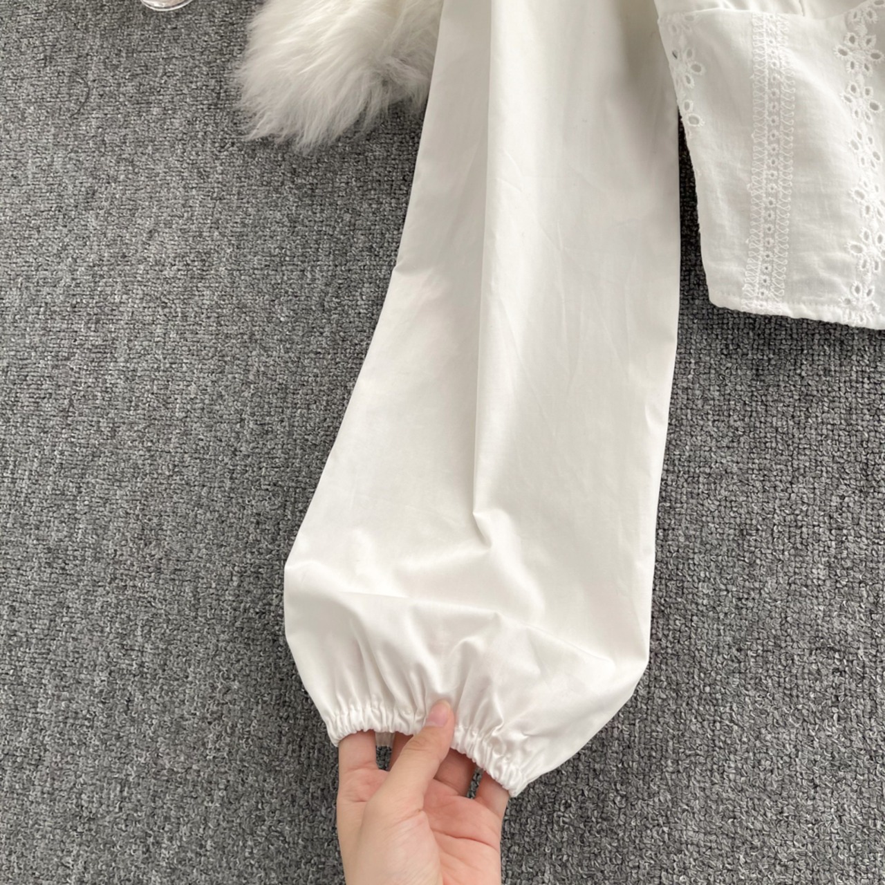 コートスタイル露出鎖骨スクエアカラー長袖シャツレディース中空刺しゅうデザインスリムショートパフスリーブトップトレンディ ロング 刺繍 スクウェア lyxaj48282694940