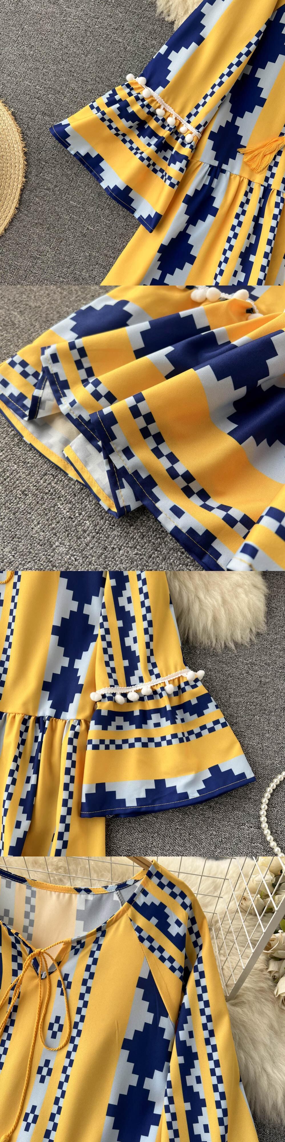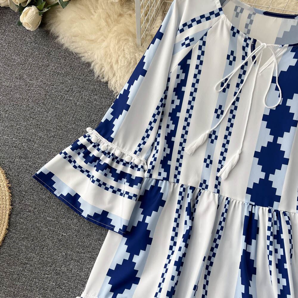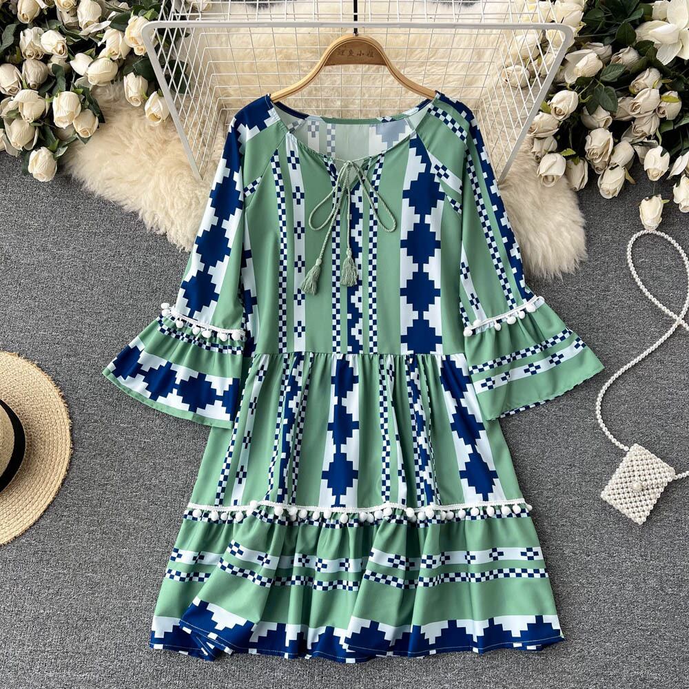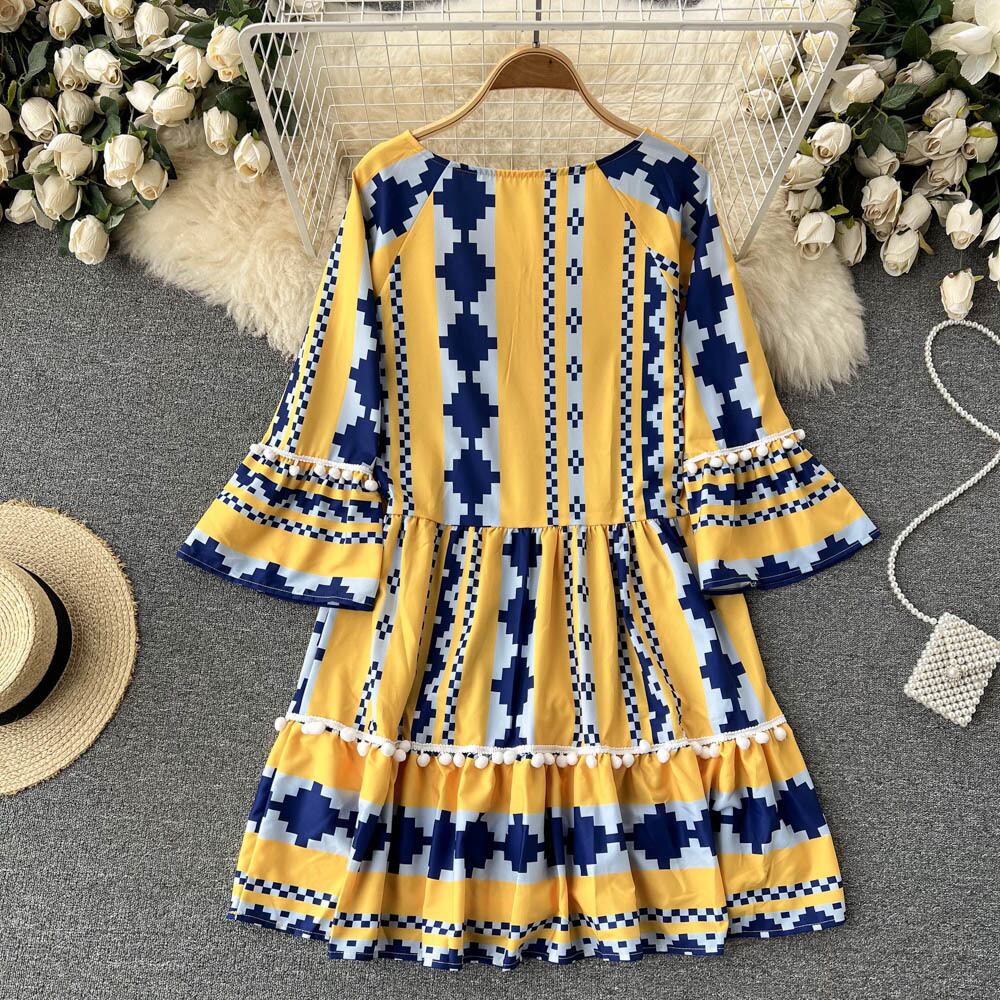 2022 new bohemian holiday style fur ball print trumpet sleeve doll shirt small fresh fashion dress lyxaj65865879394