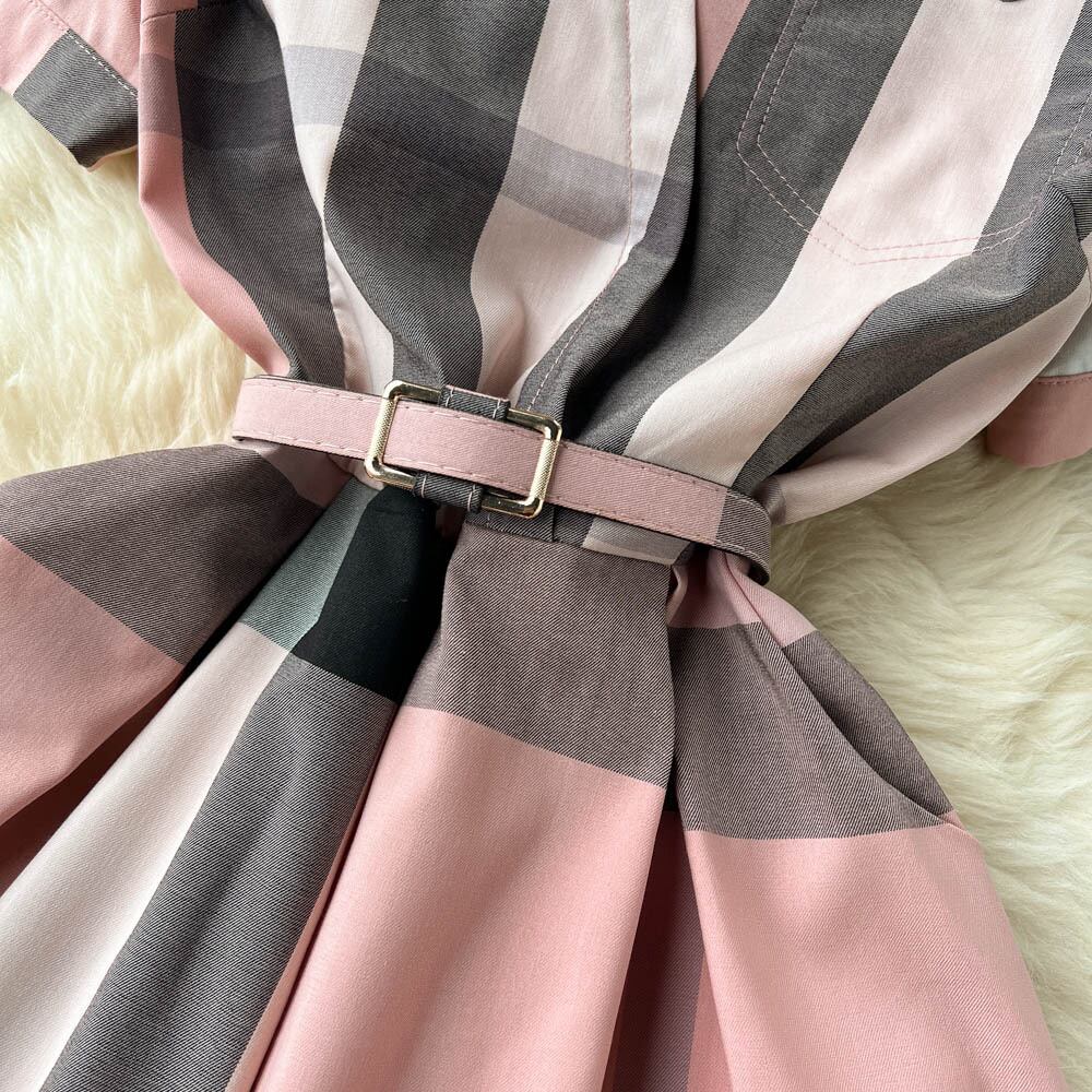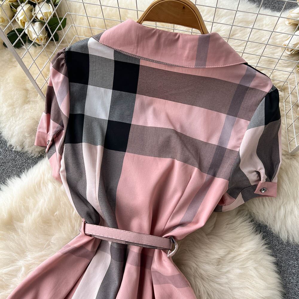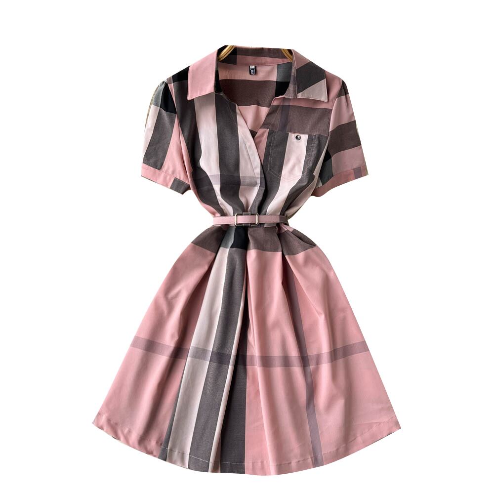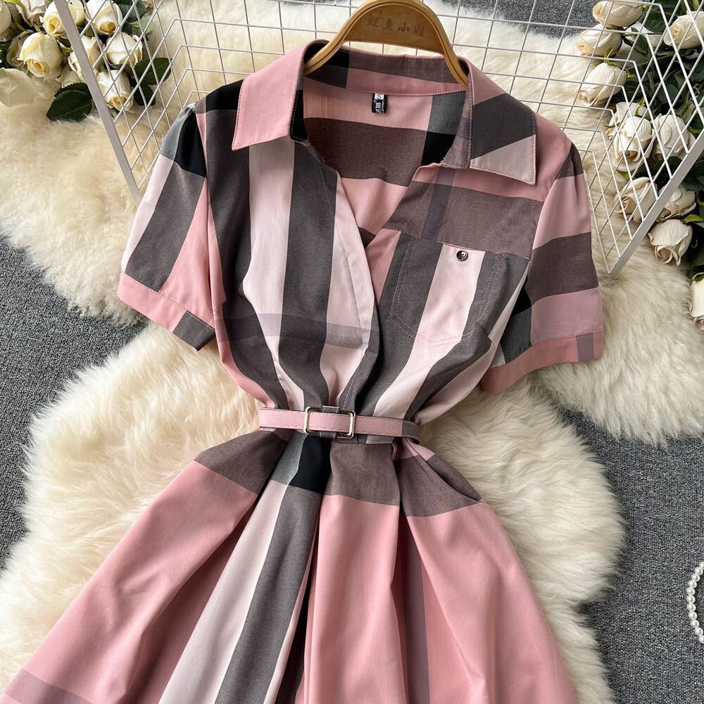 2022年夏の新しいファッショナブルなラペル気質スリムミドル丈ウエストチェック柄ドレスコントラストカラーシャツスカート サマー 夏物 lyxaj26613329530