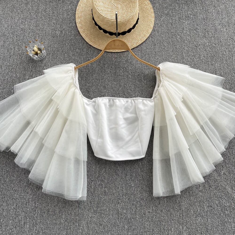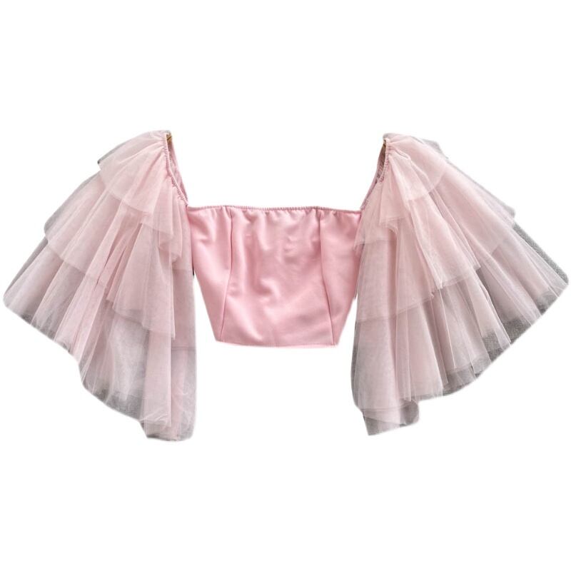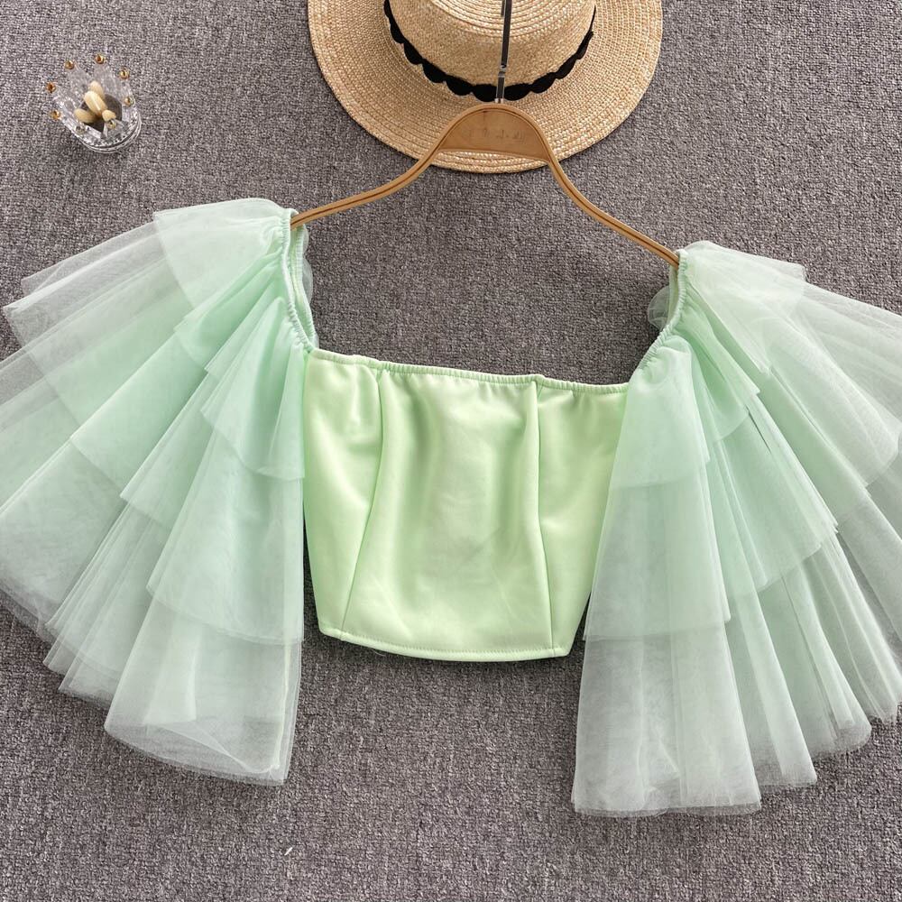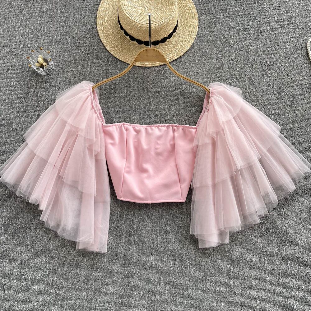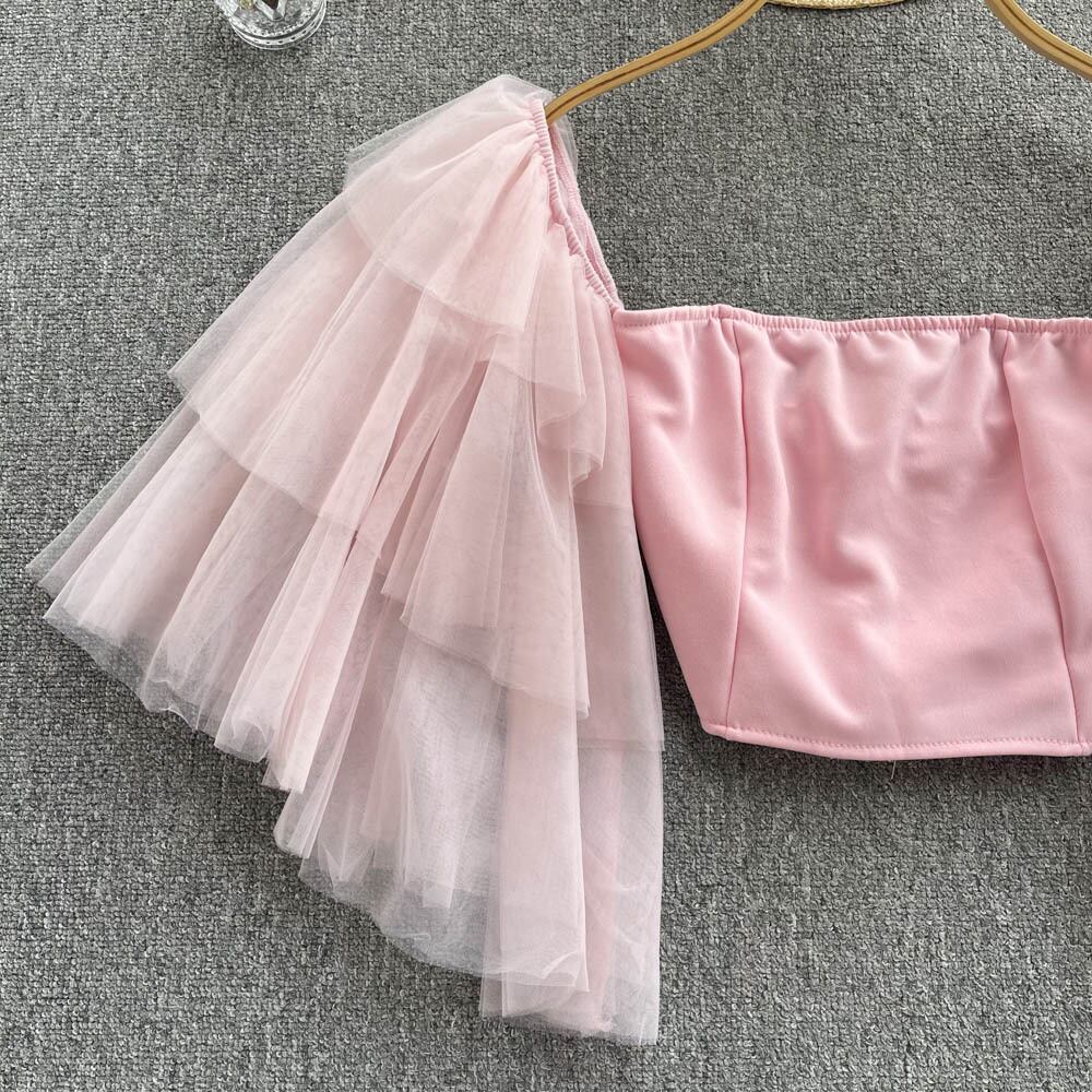 サマーメッシュチューブトップシャツスウィートニッチ年齢を減らすショートセクションスリムフィットと薄いオフショルダーワンワードカラー半袖トップウィメンズ 大人ガーリー キュート カジュアル 夏物 lyxaj14161480177