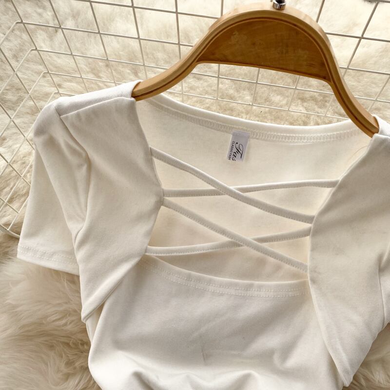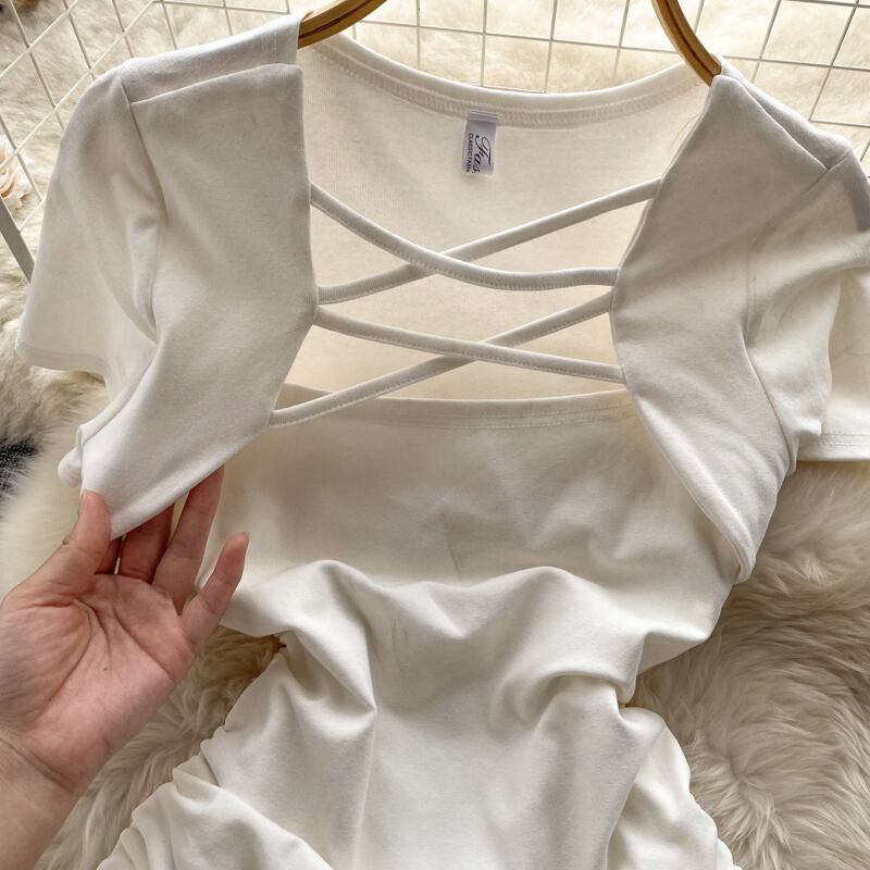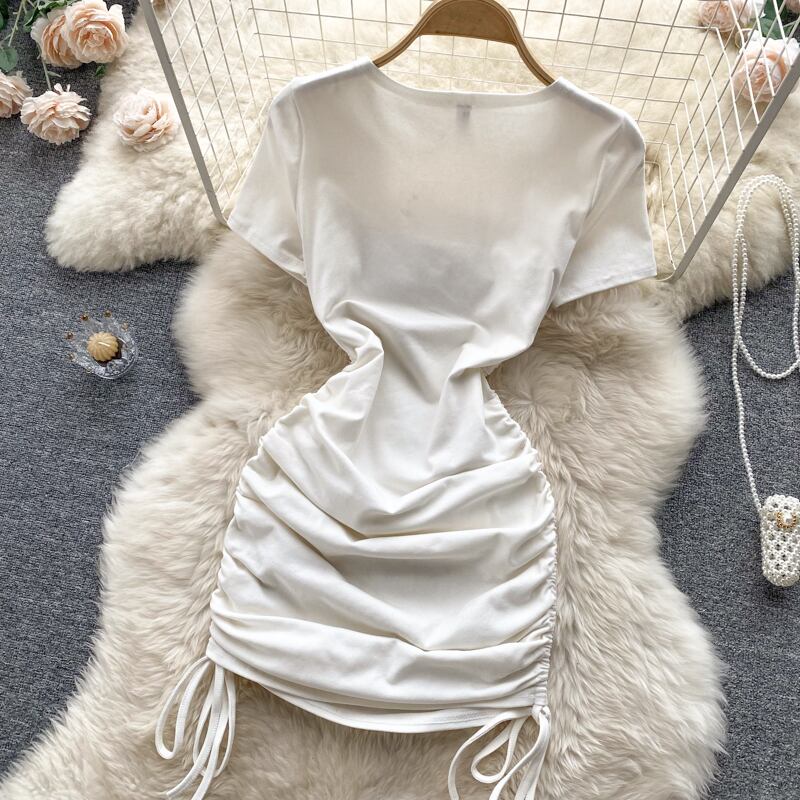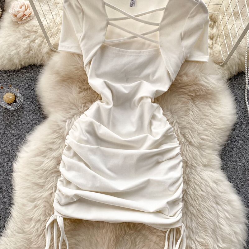 2022年夏のデザインセンスホットガールスリムスリムスクエアネックドレス半袖セクシードローストリングヒップショートスカートトレンディ ハーフスリーブ サマー 夏物 スクウェア lyxaj89959635573