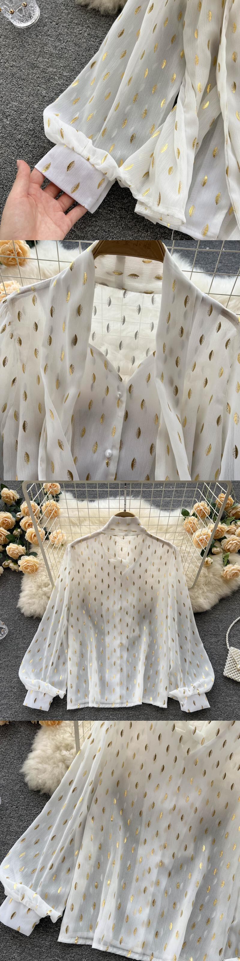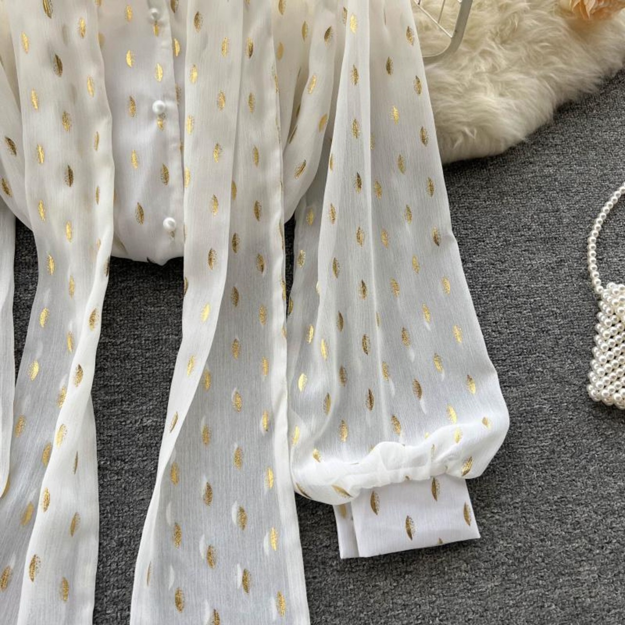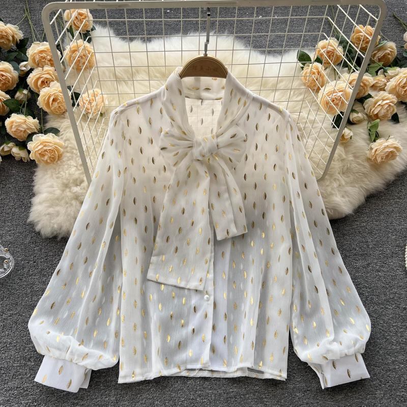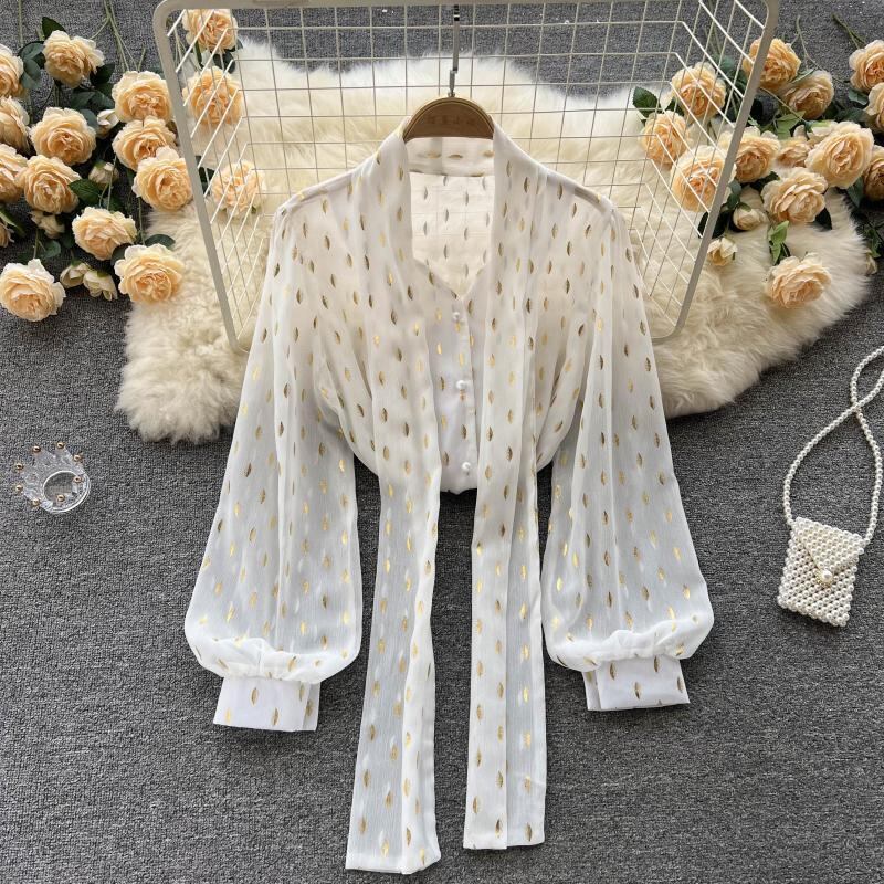 2022年春の新デザインセンスレトロな小さな白い花のステッチ不規則なボタンカレッジスタイルの長袖の白いシャツの潮 ロング ホワイト スプリング 春物 フラワーデザイン lyxaj96317997819