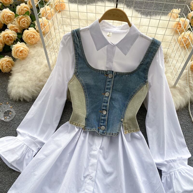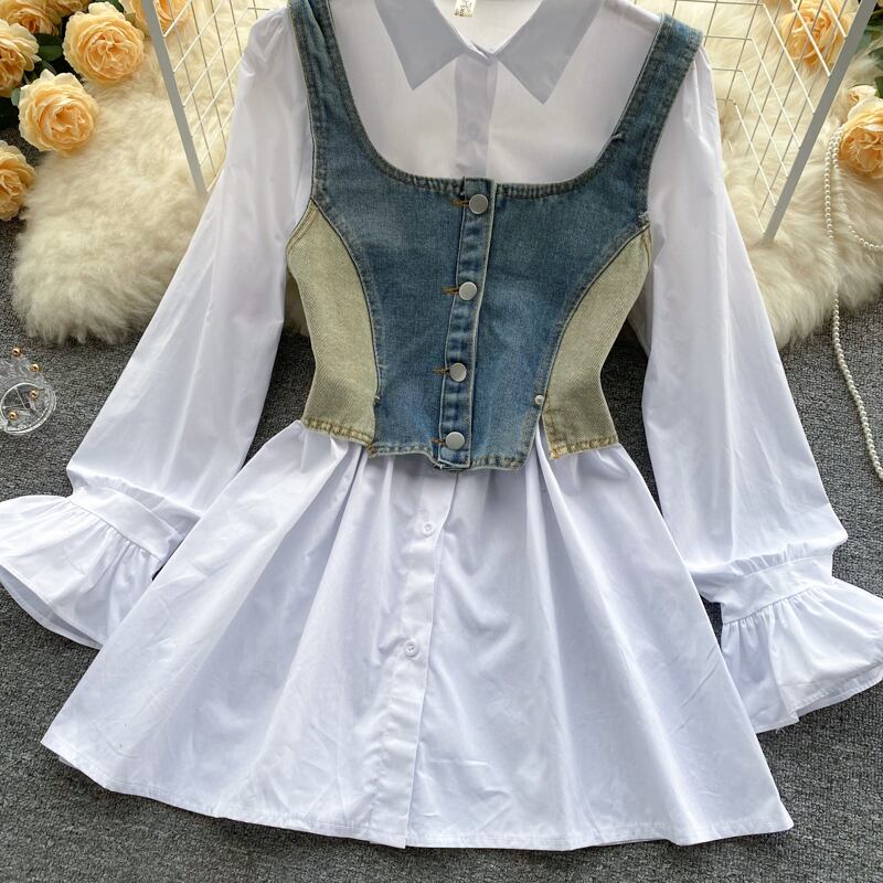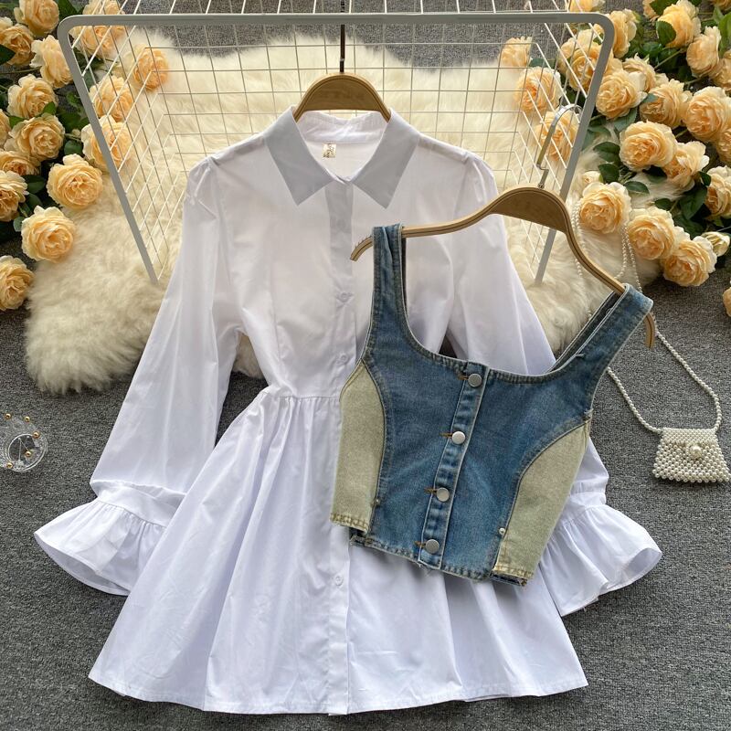 ファッショナブルな洋風の年齢を減らすスーツ、女性のスクエアカラー、ボタン付きスリング、デニムベスト、ルーズな長袖シャツ、ツーピースのスーツ ロング スクウェア lyxaj48455455132