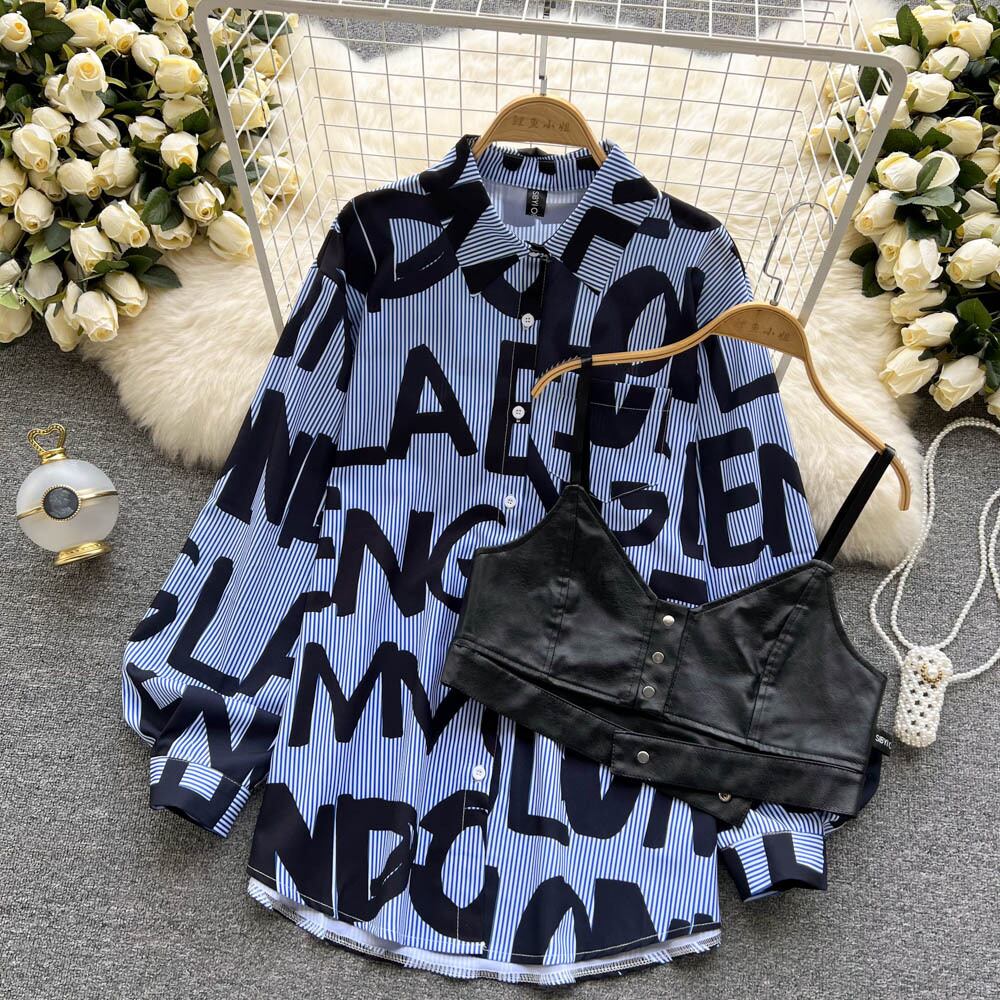puレザーキャミソールレディースショートトップ+ストライプレターシャツレディースデザインセンスニッチシャツツーピーススーツ lyxaj43232978301
