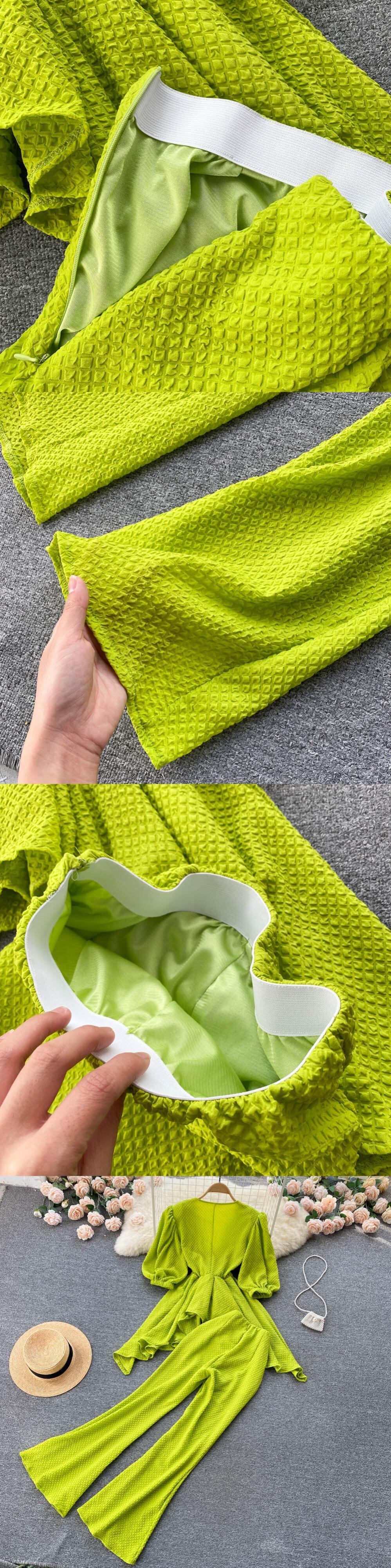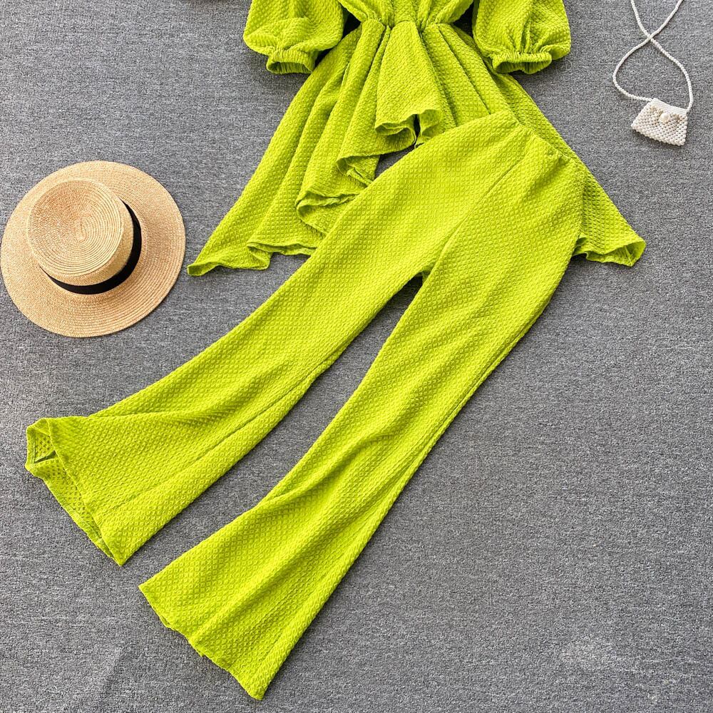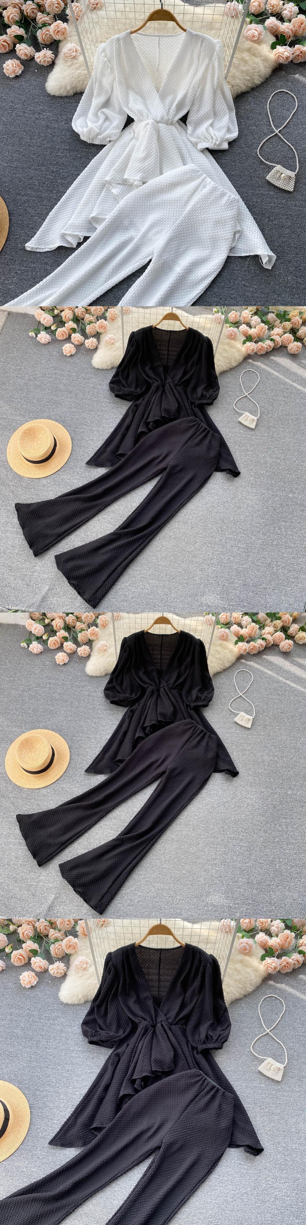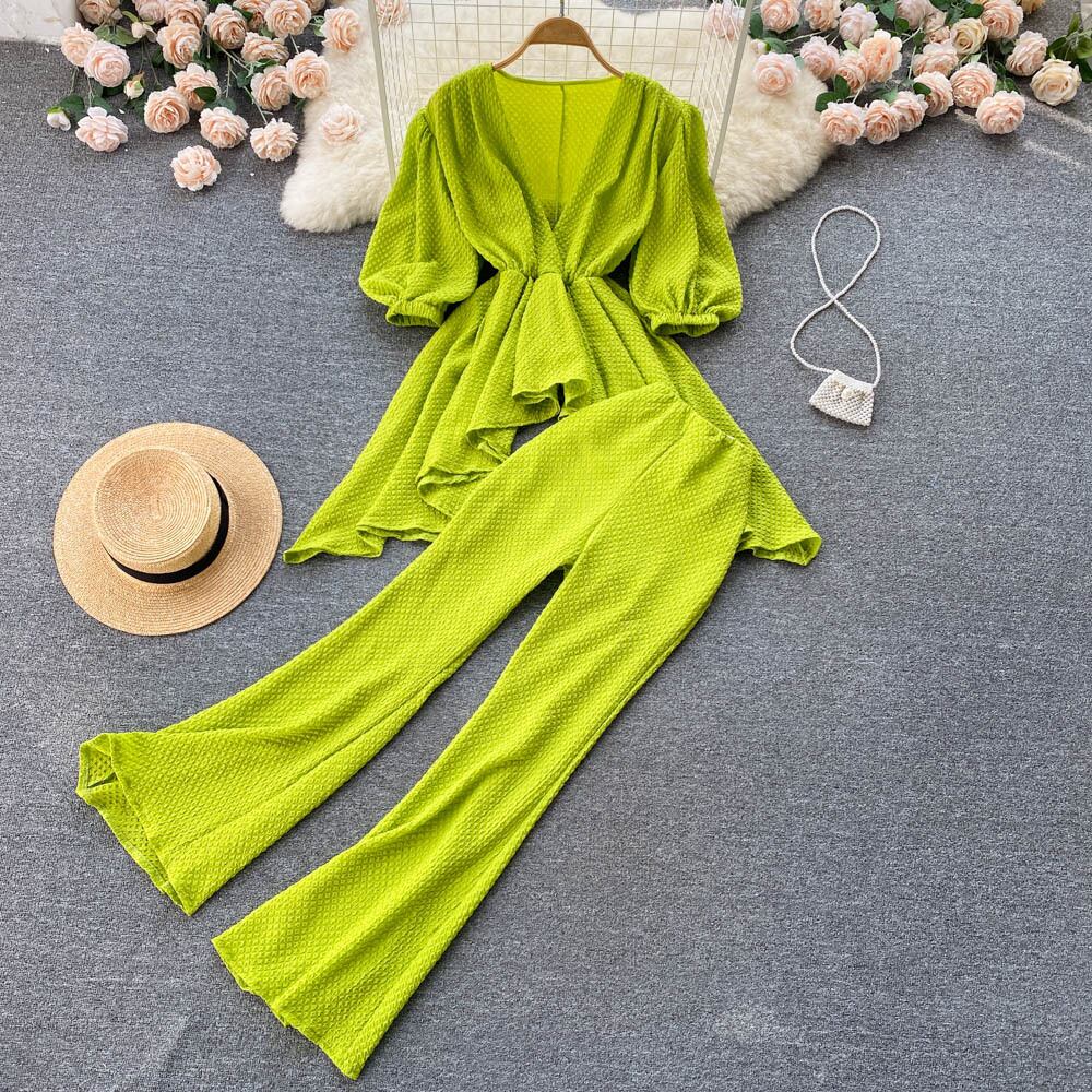 軽くて馴染みのある気質セレブスーツ春夏新作ルーズVネックイレギュラートップマイクロフレアパンツツーピースセット スプリング 春物 サマー 夏物 lyxaj27334353777