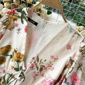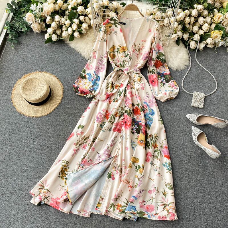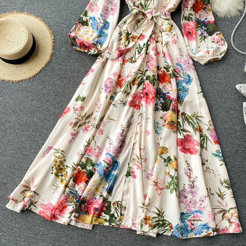 休暇旅行写真森の妖精スタイルのドレス深いVバブルスリーブディスクバックルタイウエスト薄い花柄のスカート lyxaj74232525121