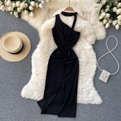 陰謀ホルタードレス女性の夏のウエストウエストデザインニッチプリーツセクシーバッグヒップスリット薄い黒のドレス ブラック サマー 夏物 lyxaj41179166786