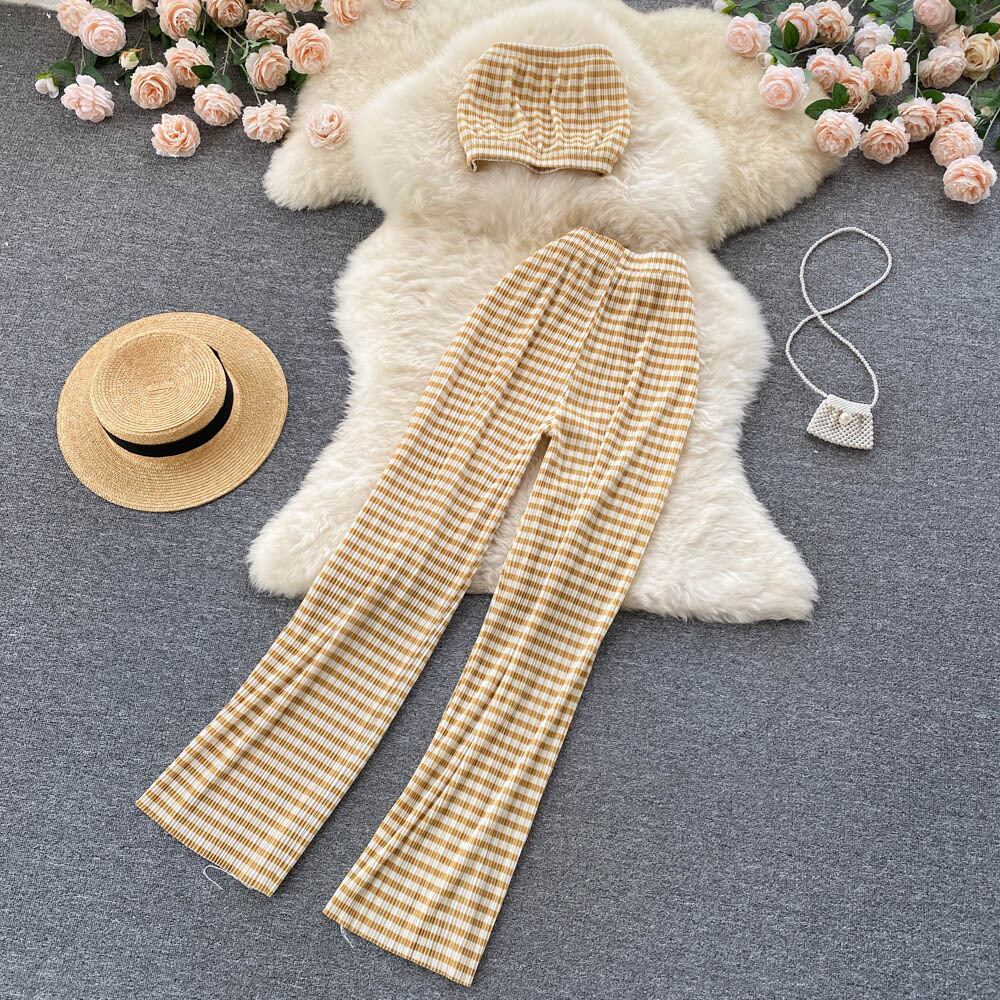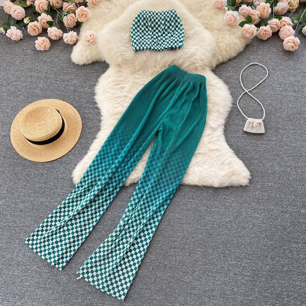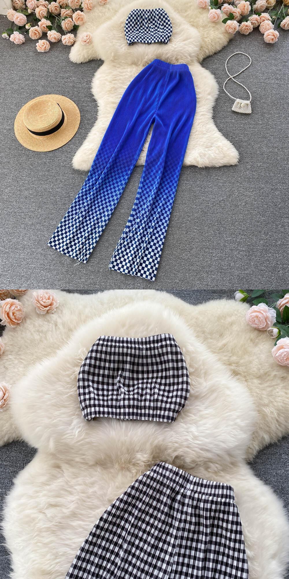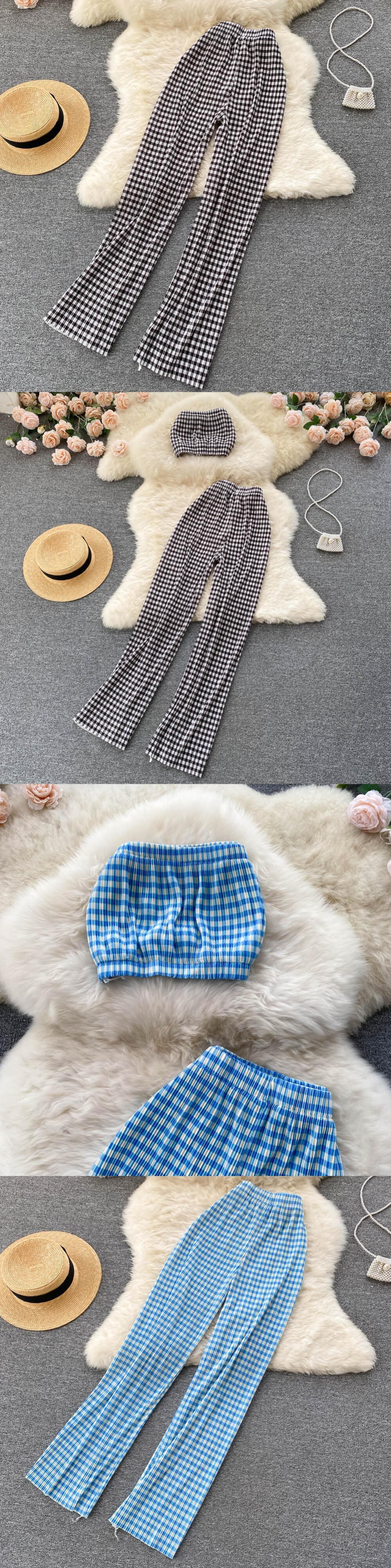 甘くてセクシーなアウターウェアチューブトップチェック柄ショートベスト2022夏の新しいカジュアルワイドレッグパンツパンツスーツ 大人ガーリー スウィート キュート サマー 夏物 lyxaj49132830304