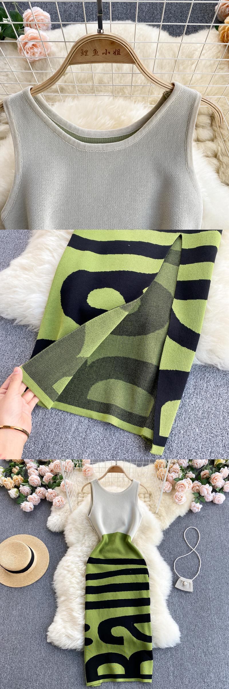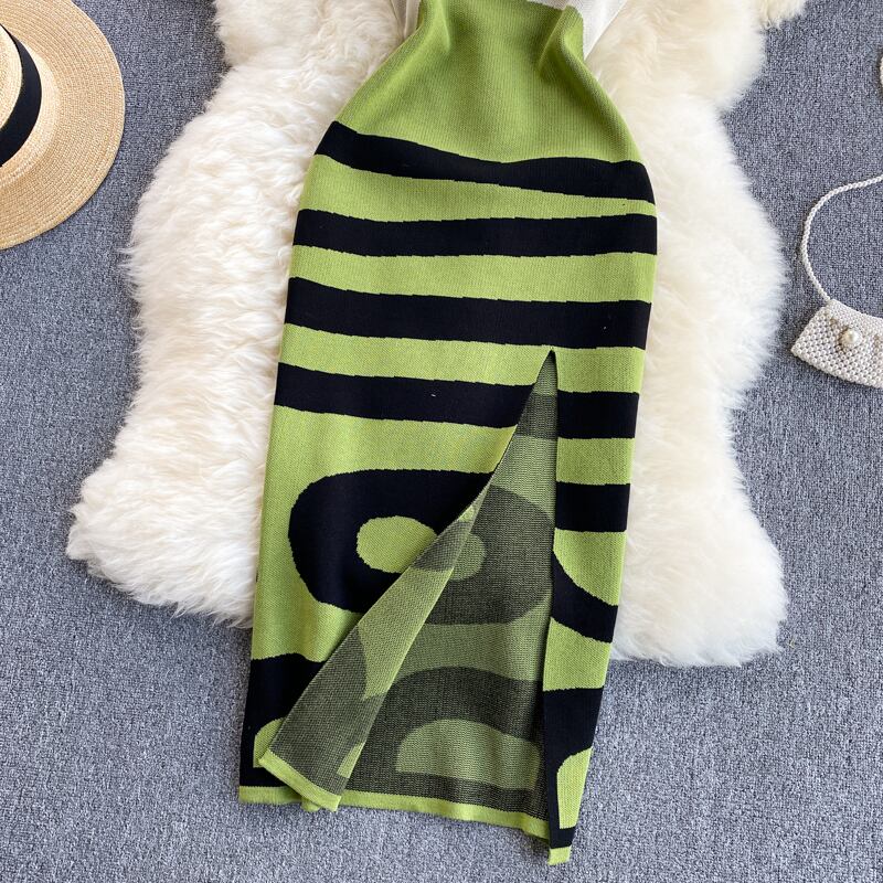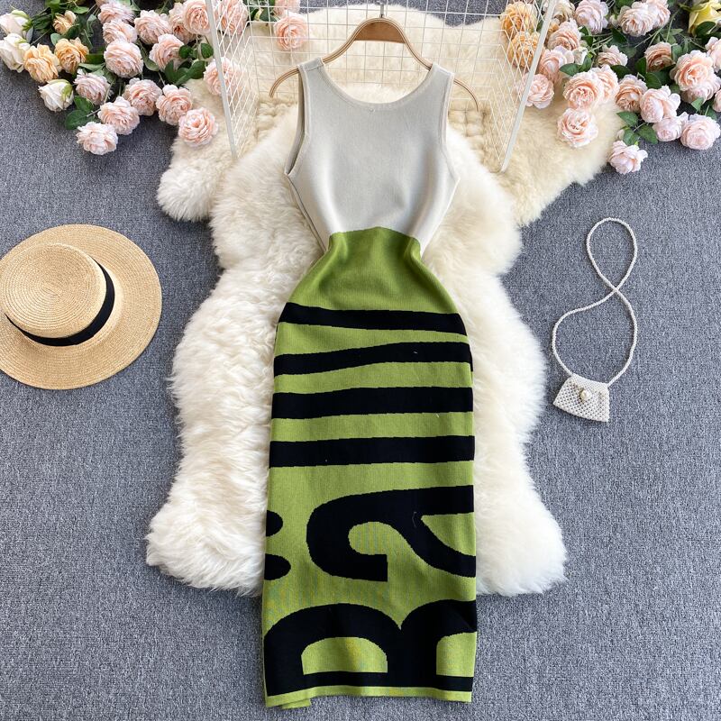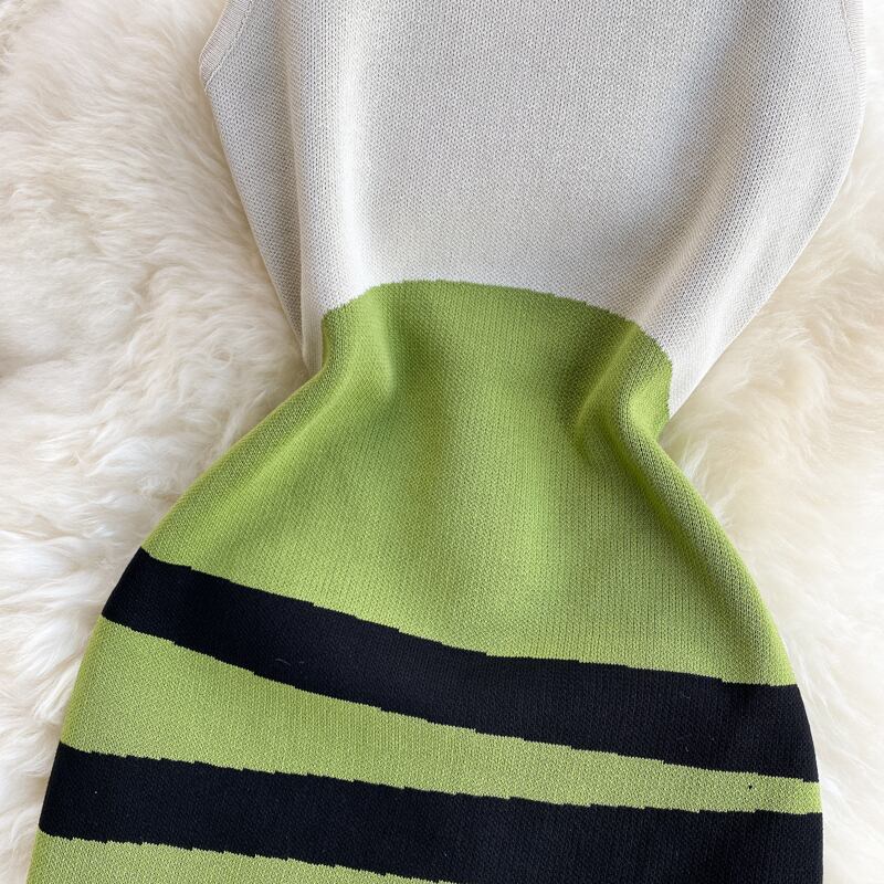 ヨーロッパとアメリカの女性の夏の新しいデザインセンスカラーブロッキングストライプスリムミドル丈スキームスリットニットドレス女性 サマー 夏物 ヨーロピアン lyxaj50385196083