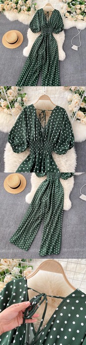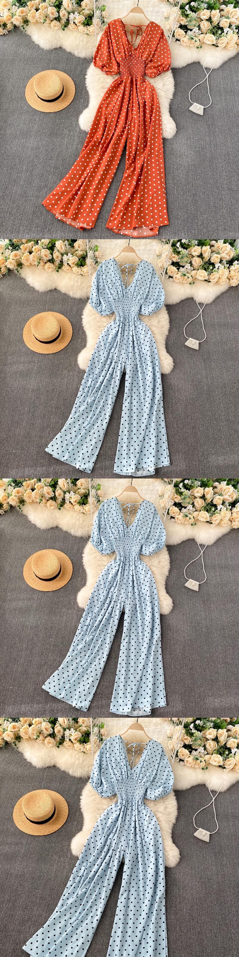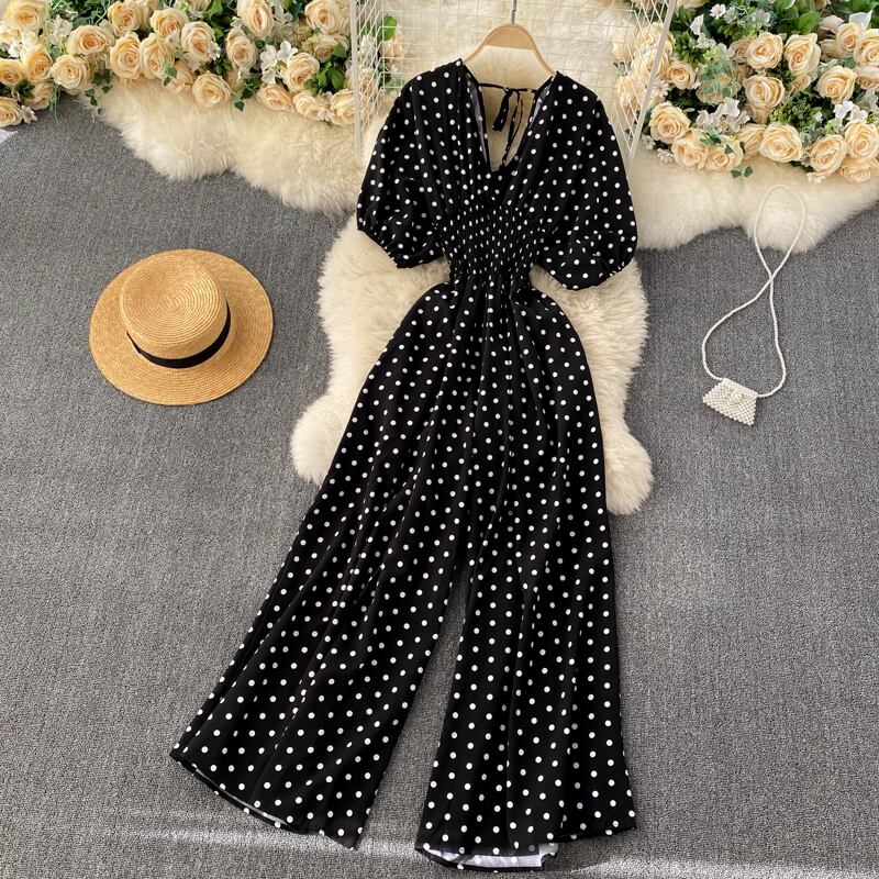 European and American ins fashion bloggers private clothing holiday storm point puff sleeves waist and slim long wide-leg one-piece pants ロング スリム ヨーロピアン lyxaj91021964387
