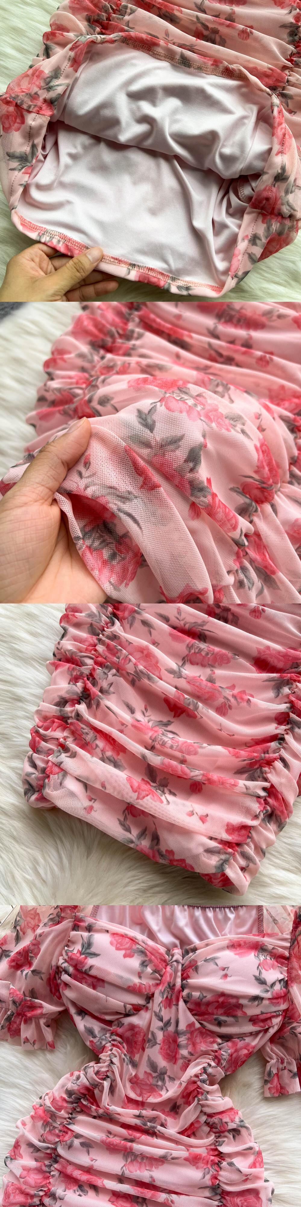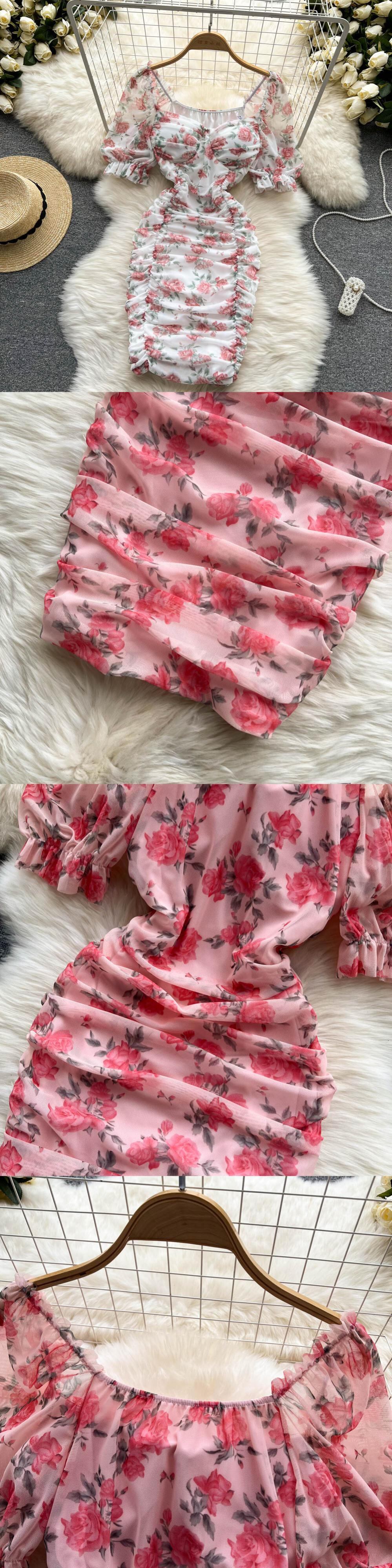 セクシーなバッグヒップフォールドフレンチ気質デザインセンスサマーニューフローラル半袖ミドル丈気質ドレストレンディ 夏物 花柄 lyxaj56481401137