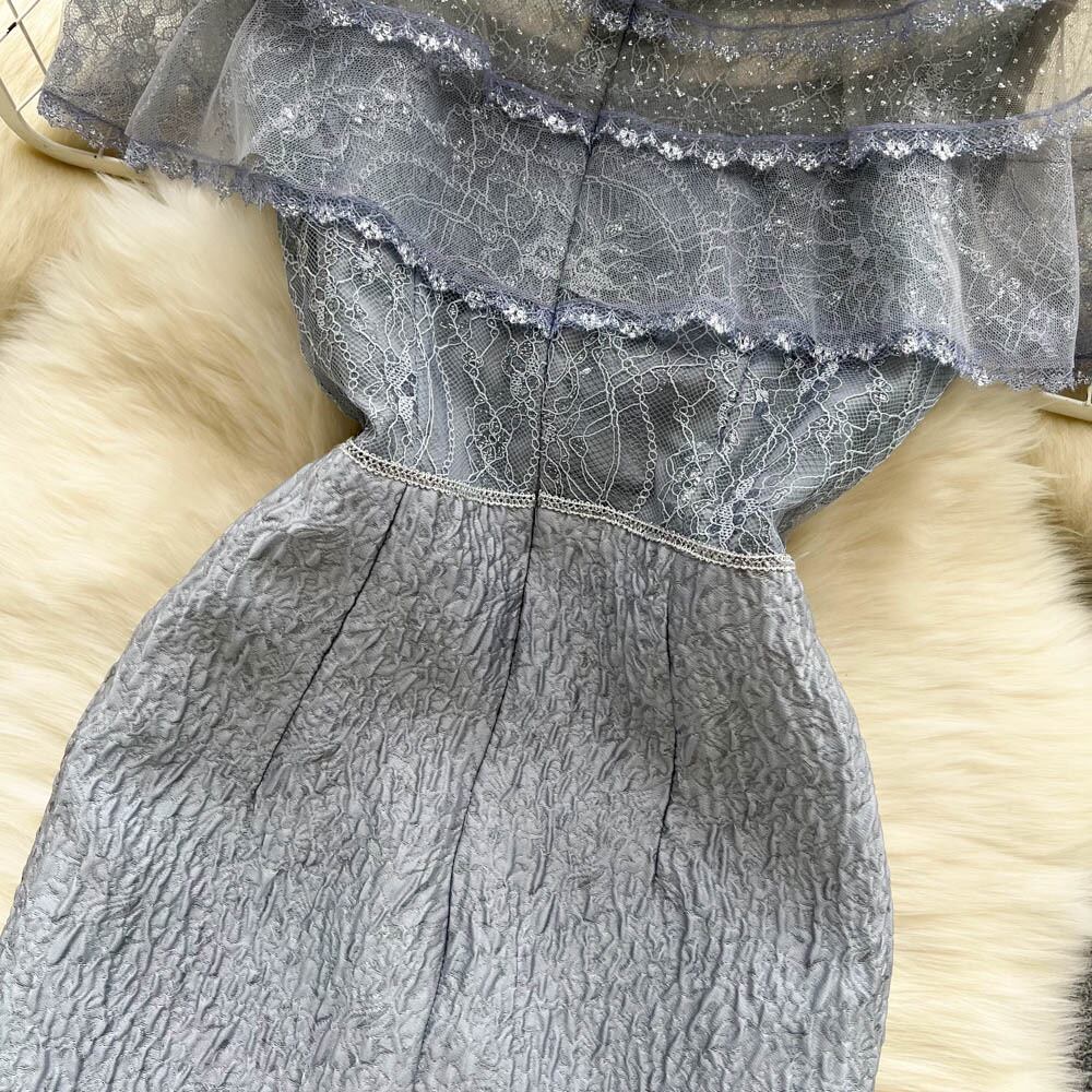 2022年夏の新気質スタンドカラーメッシュフリルウエストとスリムなAラインフォールドジャカードドレス サマー 夏物 lyxaj22980118203
