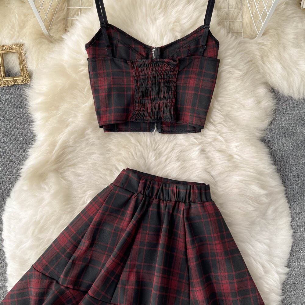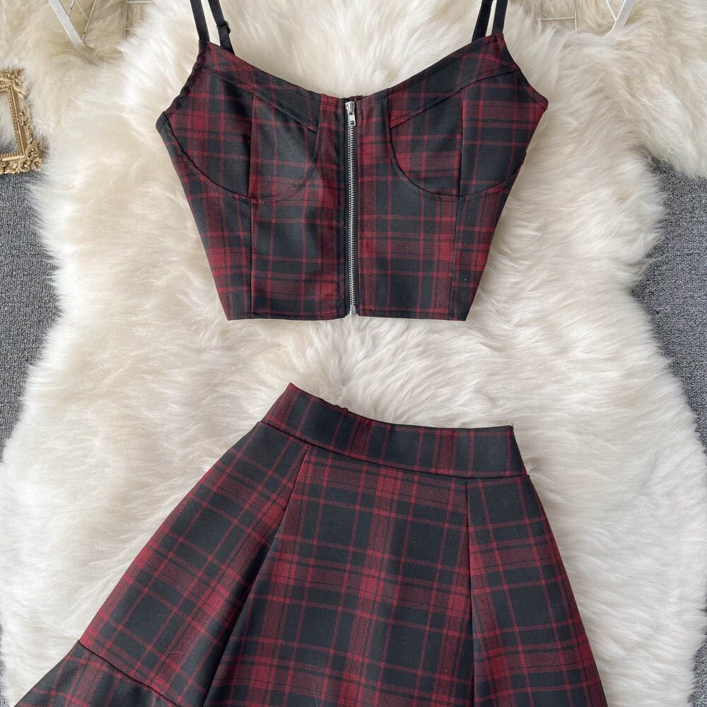 レトロなチェック柄のスーツ夏の新しい甘くてスパイシーなスタイルのVネックサスペンダークロップトップハイウエストスカートファッショナブルなツーピーススーツ ハイウェスト 大人ガーリー スウィート キュート カジュアル サマー 夏物 lyxaj8830420006