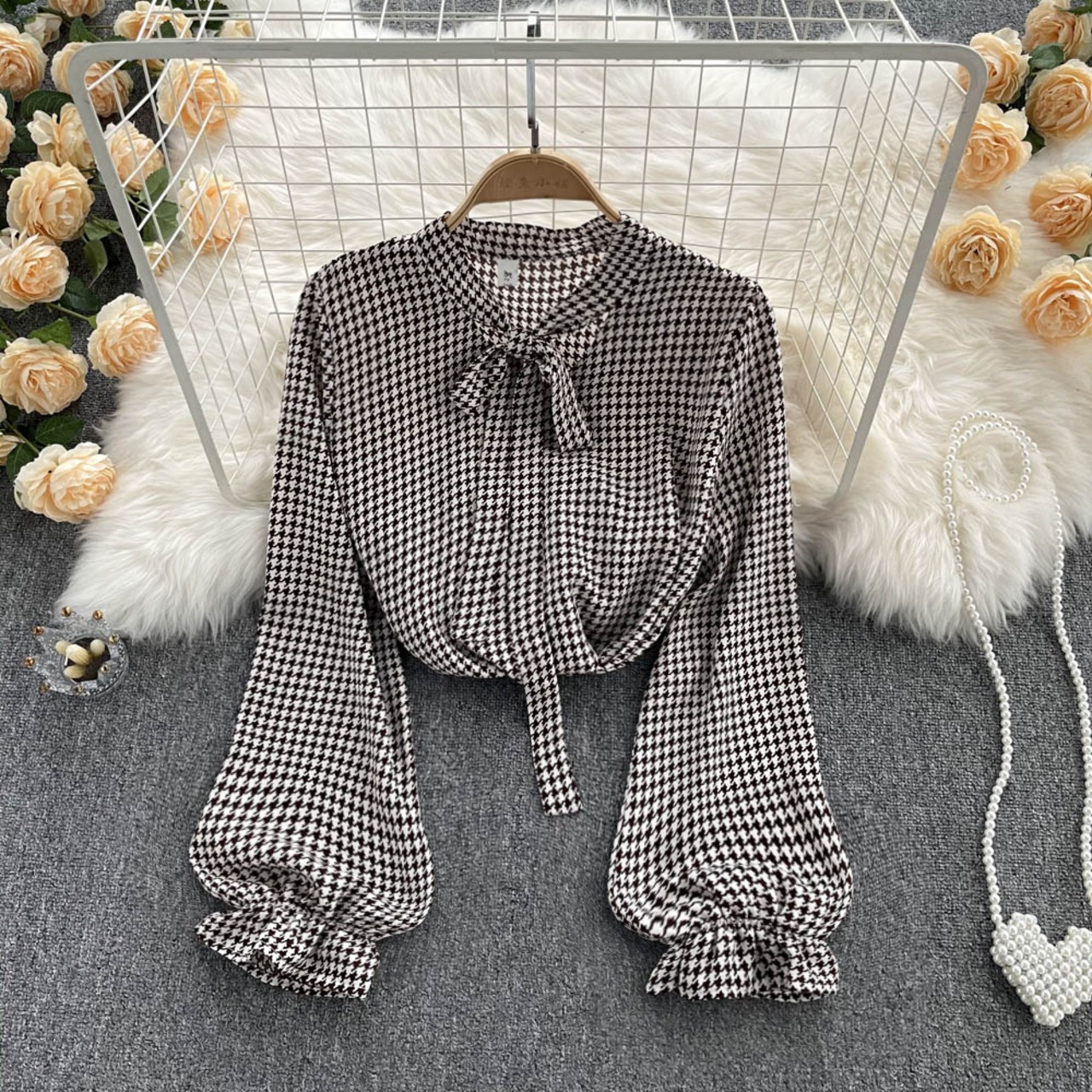 Houndstooth French shirt women's loose design niche bow long-sleeved shirt retro versatile temperament top ロング リボン レトロ lyxaj18333551219