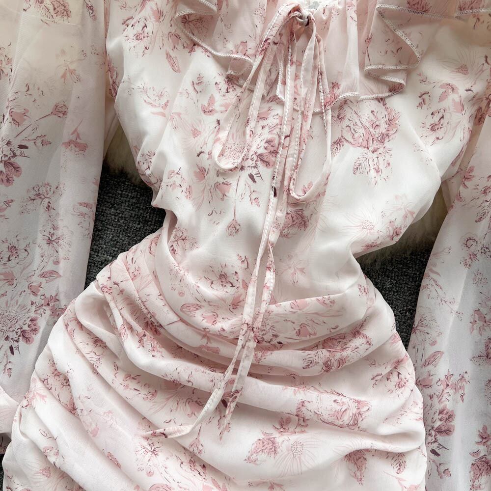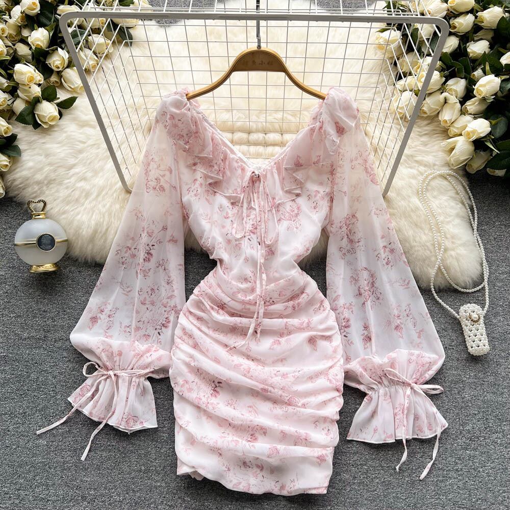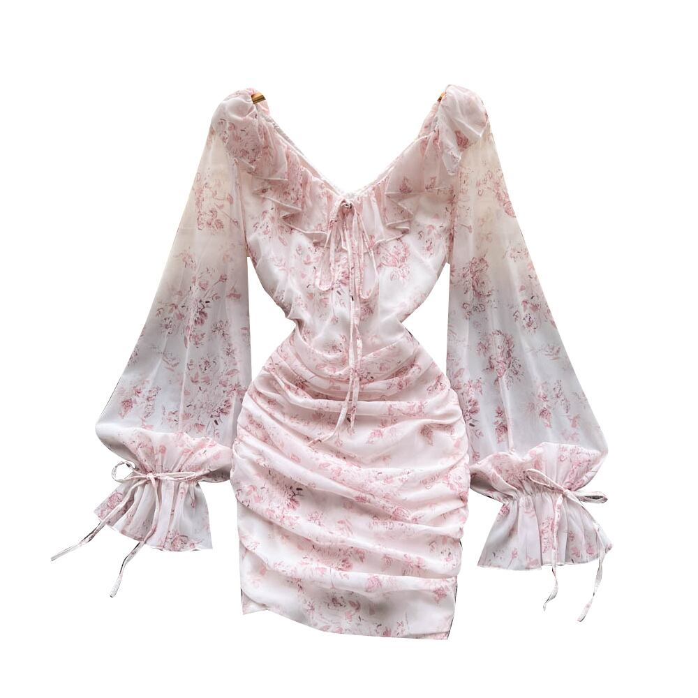 フランスの優しい風ピンクフローラルフェアリードレス夏の新しいシフォンVネックスリムプリーツヒップスカート サマー 夏物 花柄 lyxaj60938473840