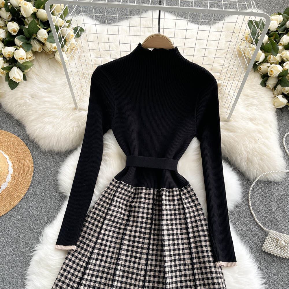 2021年秋新作長袖ニットシングルブレスト自家栽培スタンドカラーレディース気質ミドル丈フレンチドレストレンド ロング オータム 秋物 lyxaj25956340203