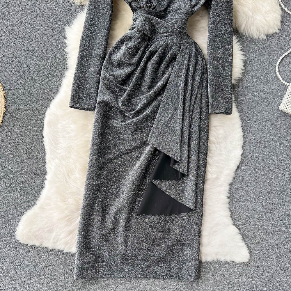 version of the temperament V-neck cross fashion lace waist is thin long-sleeved dress women's knee-length dress trendy ロング レース Vネック lyxaj13139617474