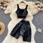 小さなホットな女の子のPUレザースーツサマードレス2022新しい女性のサスペンダーショートトップハイウエストショーツツーピースセット ハイウェスト 夏物 ブルマー lyxaj327111679