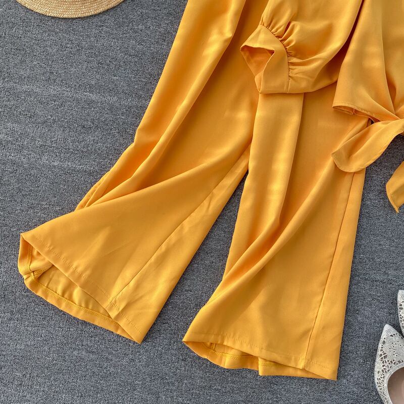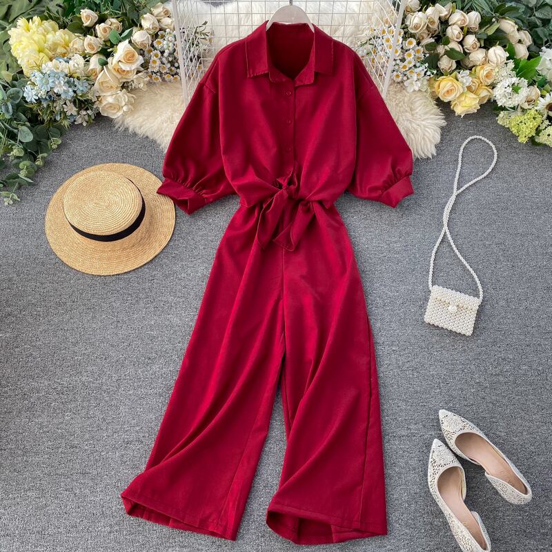 ホリデースタイルツーピースセット2020新しいサスペンダープリーツワイドレッグジャンプスーツ+スタンドカラー半袖カーディガンシャツレディースタイド lyxaj95568788582