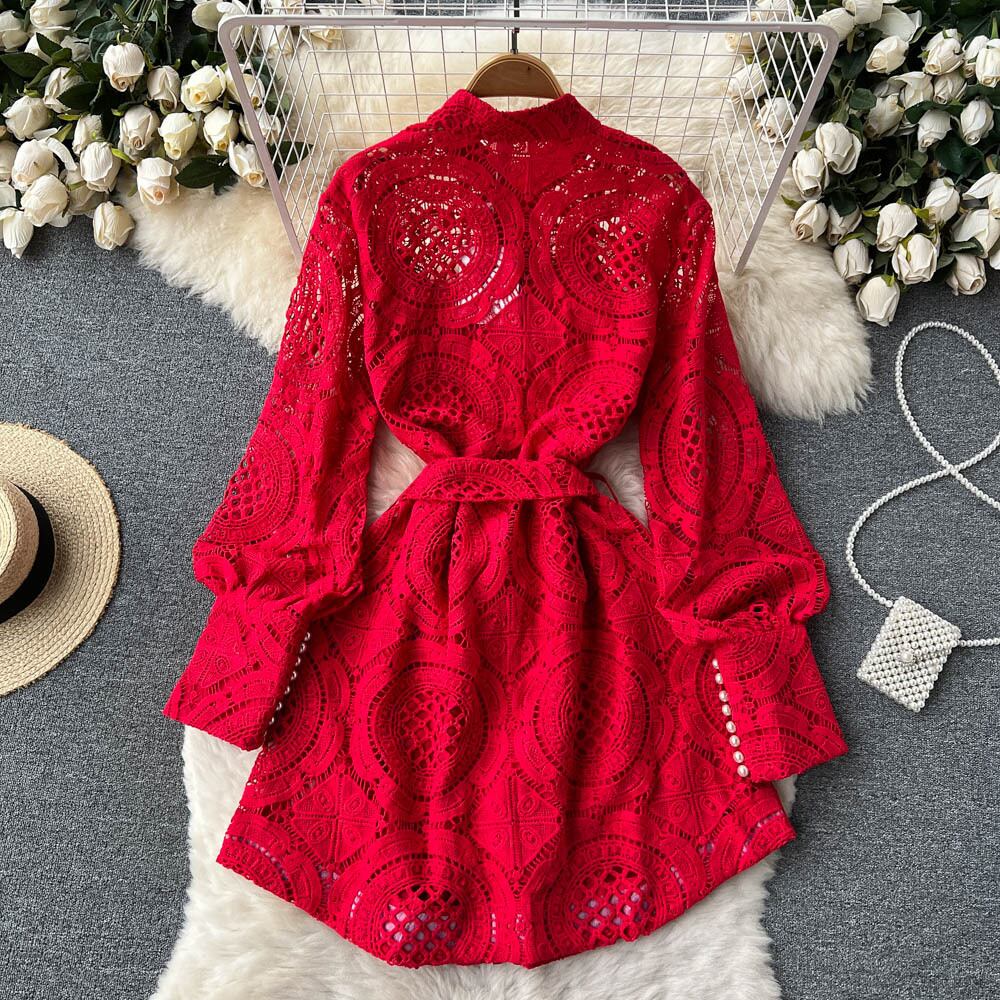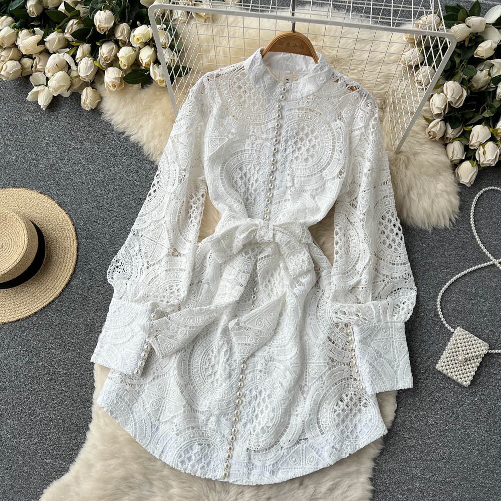 ヨーロッパの駅2022年初春新しいデザインセンス刺繡中空水溶性フラワーパールバックルレースウエストドレス 刺繍 スプリング 春物 真珠 フラワーデザイン ヨーロピアン lyxaj89897623554