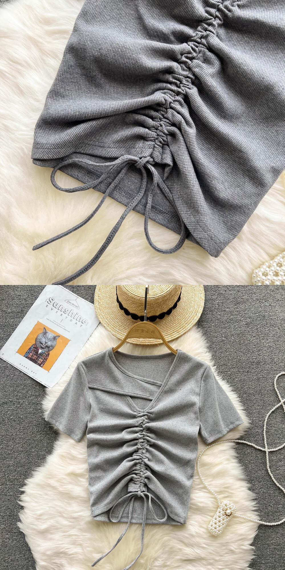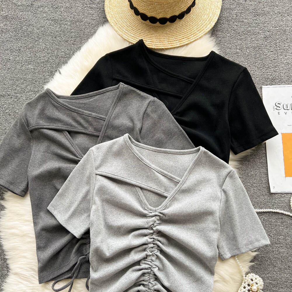 2022 summer dress new design sense irregular fashion all-match thin pleated drawstring Western style short-sleeved top T-shirt プリーツ サマー 夏物 Tシャツ lyxaj37825731831