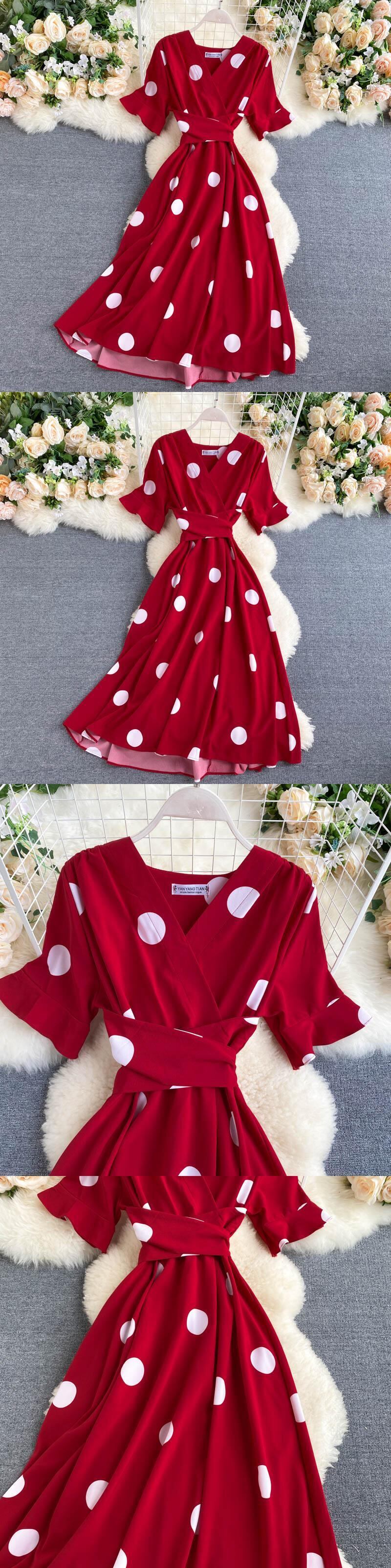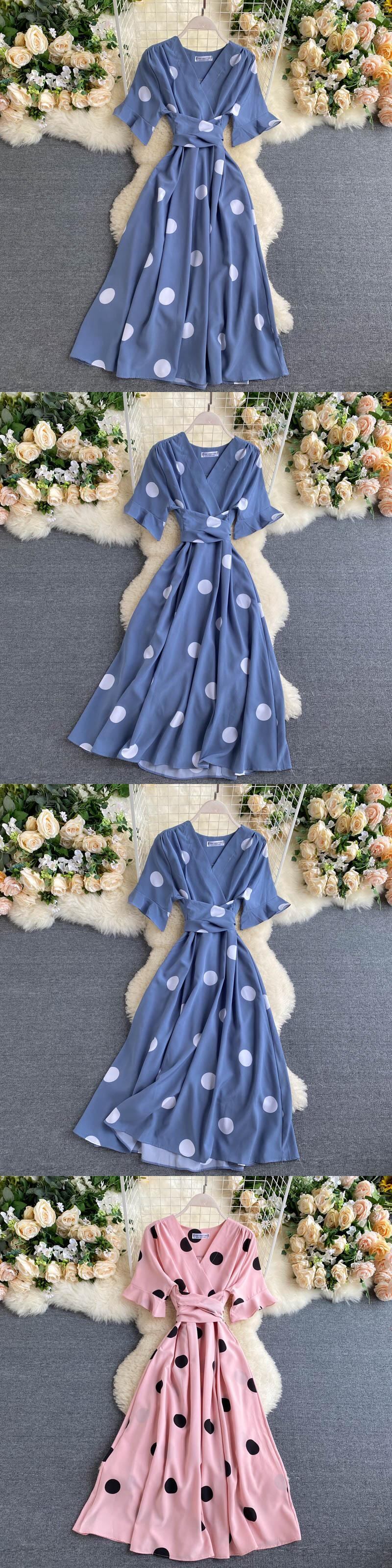 French big wave point western air trumpet short-sleeved temperament V-neck straps waist and slim mid-length dress women's summer dress サマー 夏物 Vネック スリム lyxaj45715936562