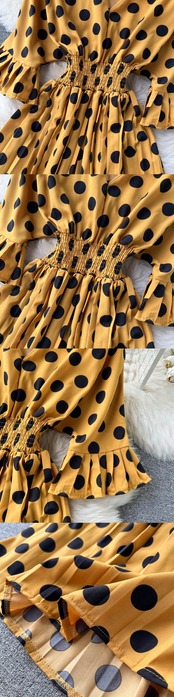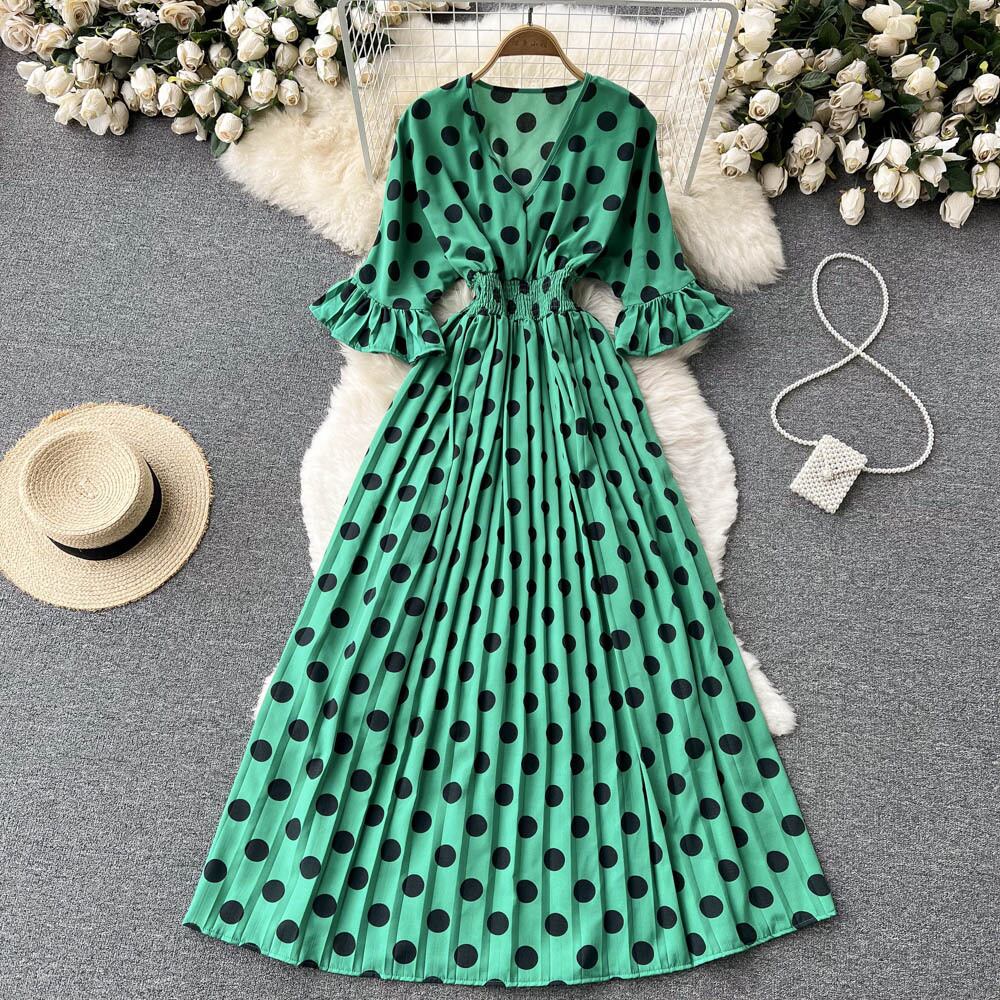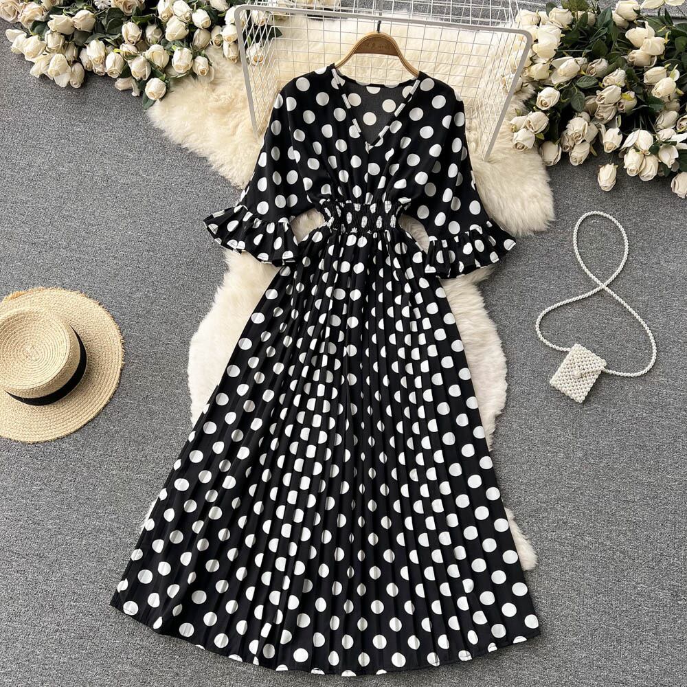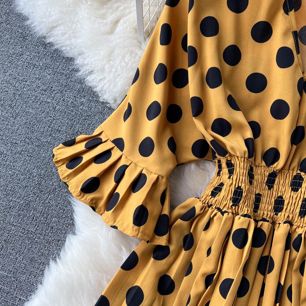 2022年夏の新しいシックなデザインセンスニッチウエストスリム水玉ドレスVネックボトミングスカート女性 サマー 夏物 lyxaj15490406988
