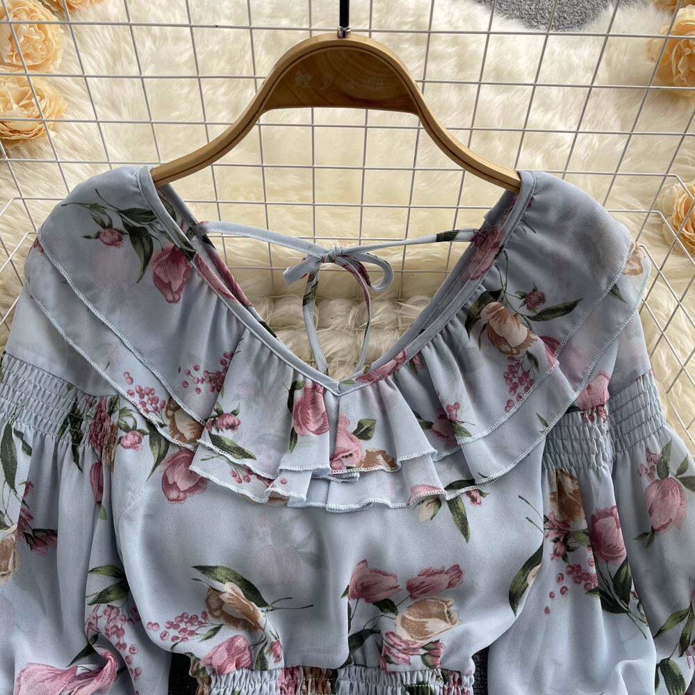 Sexy Waist Floral Square Neck Chiffon Shirt Long Sleeve Feminine Waist Short V-neck Off-the-shoulder Top All-match ショート ロング シフォン 長袖 花柄 Vネック スクウェア lyxaj60660962951