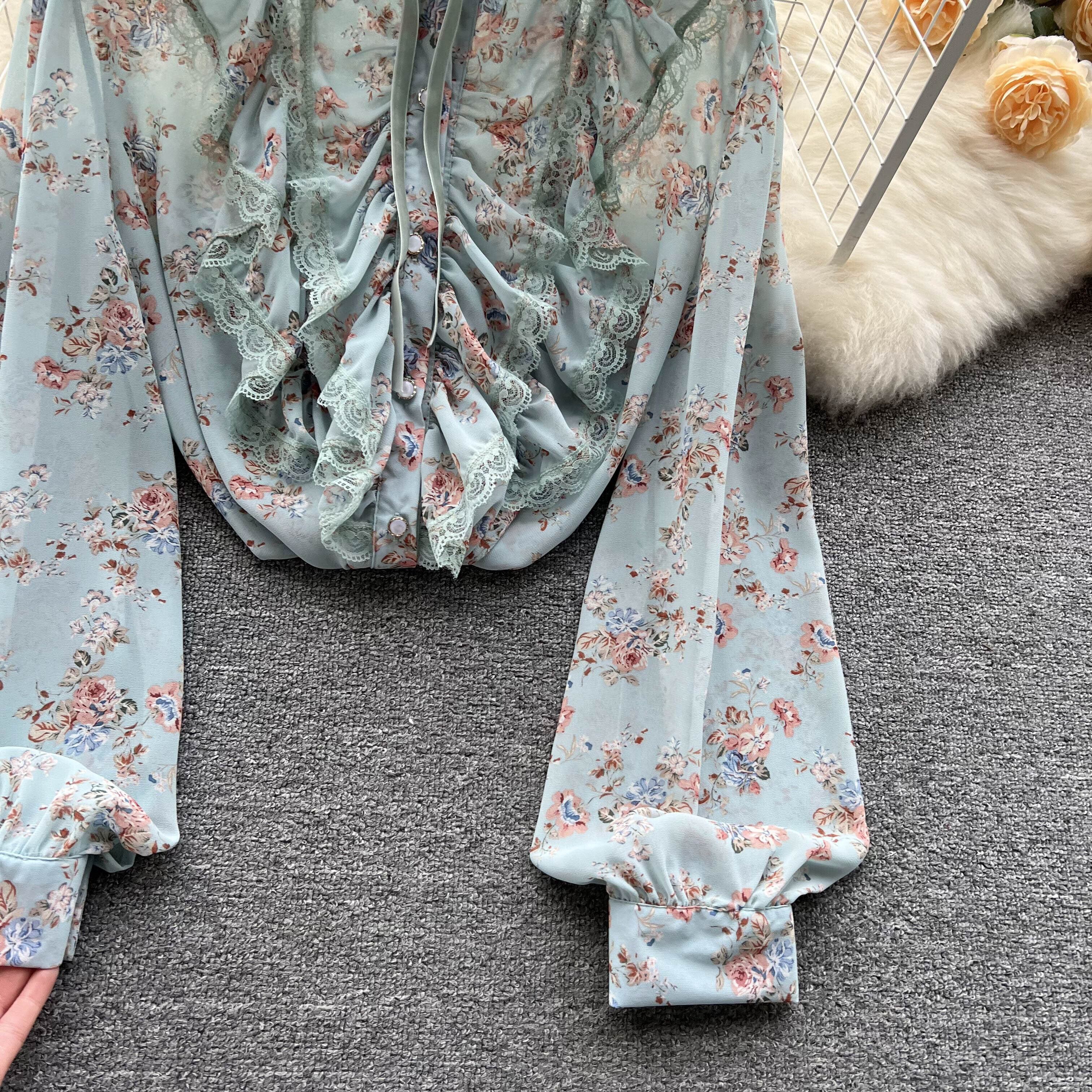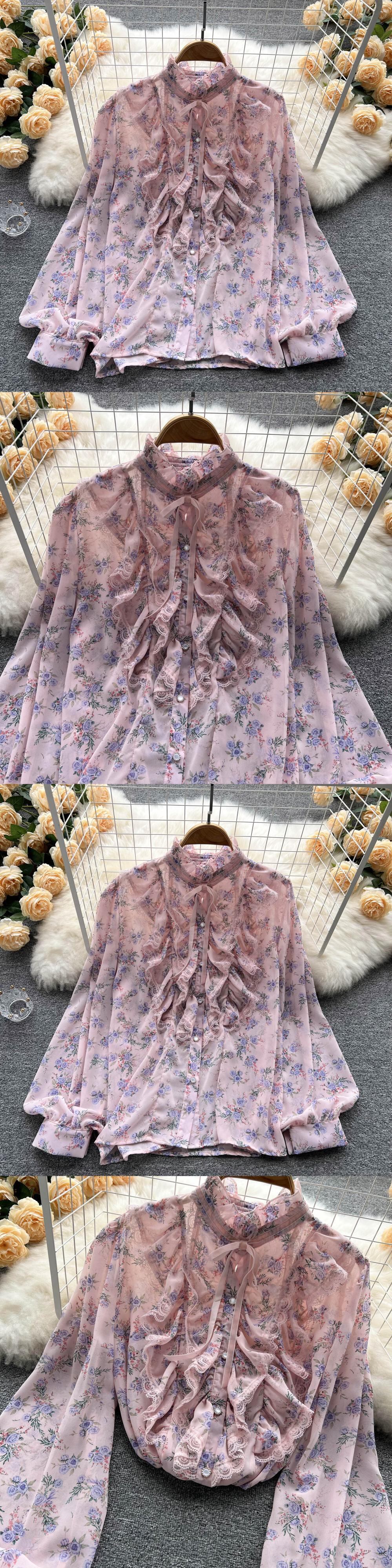 オールマッチ気質スウィートシフォンシャツルーズスタンドカラースモールフローラルパフスリーブトップフォーリンスタイルニッチシャツ女性の韓国語バージョン 大人ガーリー キュート カジュアル 花柄 lyxaj60807294521